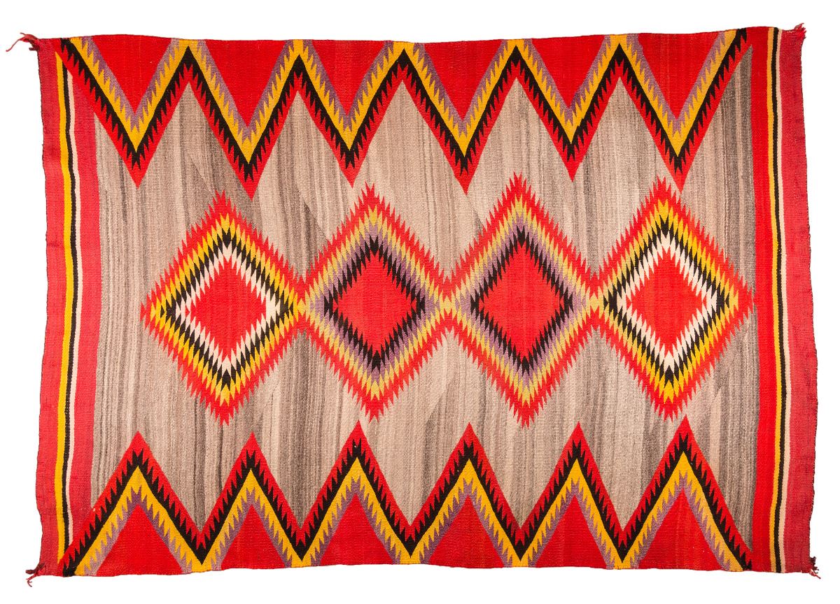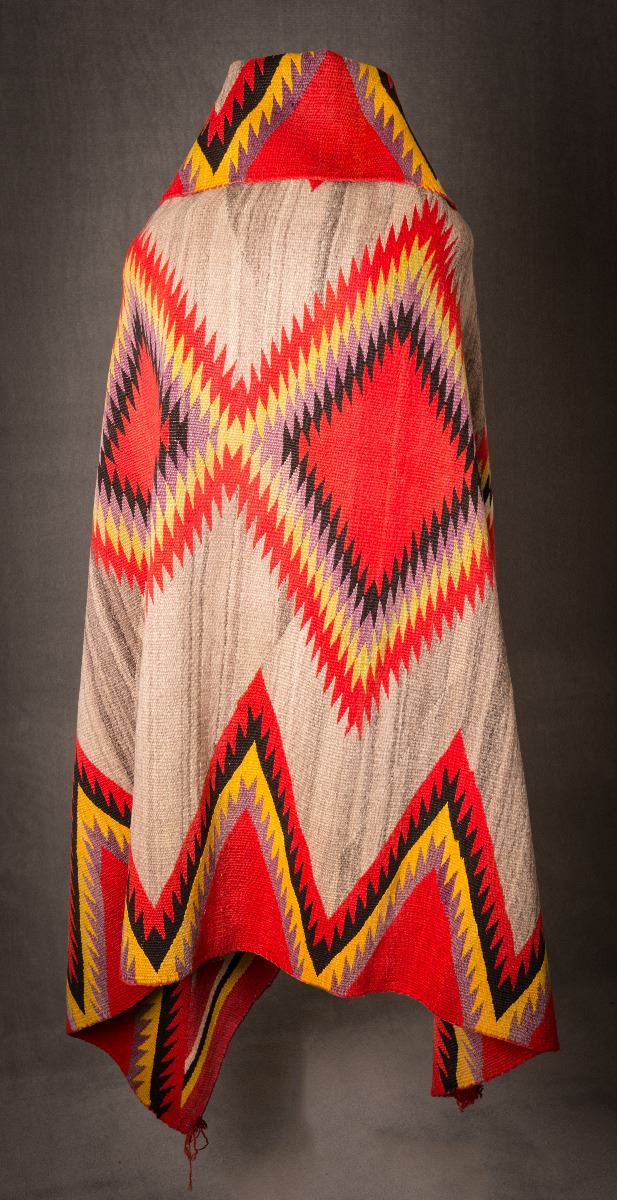 Navajo Weaving. 6'7" x 4'6". A very classy, colorful transitional wearing blanket. Vibrant colors framed nicely by the highly variegated, brown-grey field. Woven from all Native, handspun, silky, long-staple, Churro sheep wool on a wool warp. Circa 1890s.