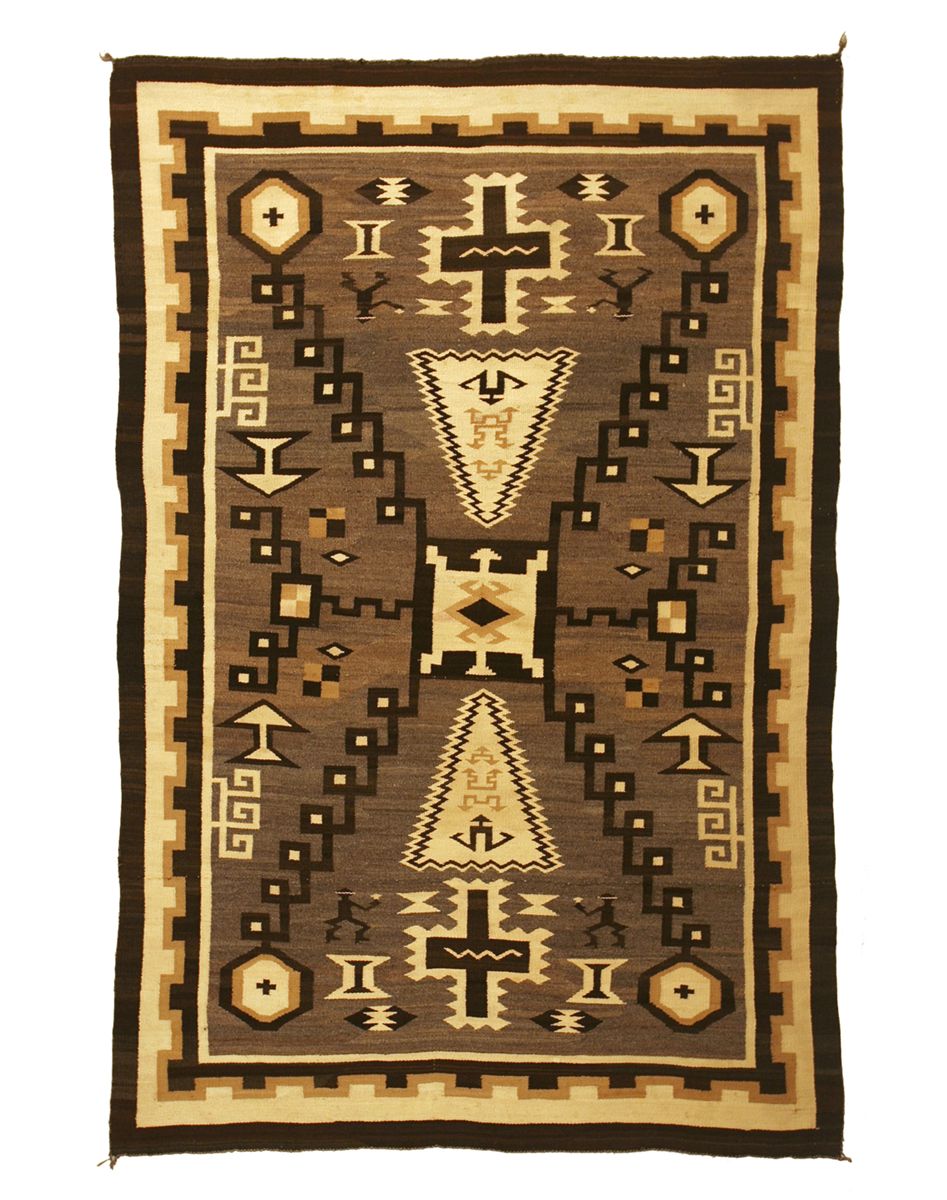Navajo Weaving. 6'8" x 4'7". J. B. Moore designed Storm pattern from the Crystal weaving area. All handspun, natural wool (except for some of the black). Unusual figural elements. Circa 1925. NOTE: Included with this lot is a 7 1/2" x 9 1/2" black & white photo of an outside portal of El Alisal, the home built by Charles F. Lummis between 1896 and 1910 on the West bank of Arroyo Seco in NE Los Angeles. Lummis (1859-1928) was a U.S. journalist and Indian rights activist. When he dies in 1928, he left a legacy of Indian lore and photography and El Alisal was preserved as the home for the Historical Society of So. CA, operating independently until 2002, when it was merged into the Autry National Center. The J.B. Moore storm pattern weaving is clearly visible in the lower right hand corner of the photo when it was on display during an exhibition at El Alisal.