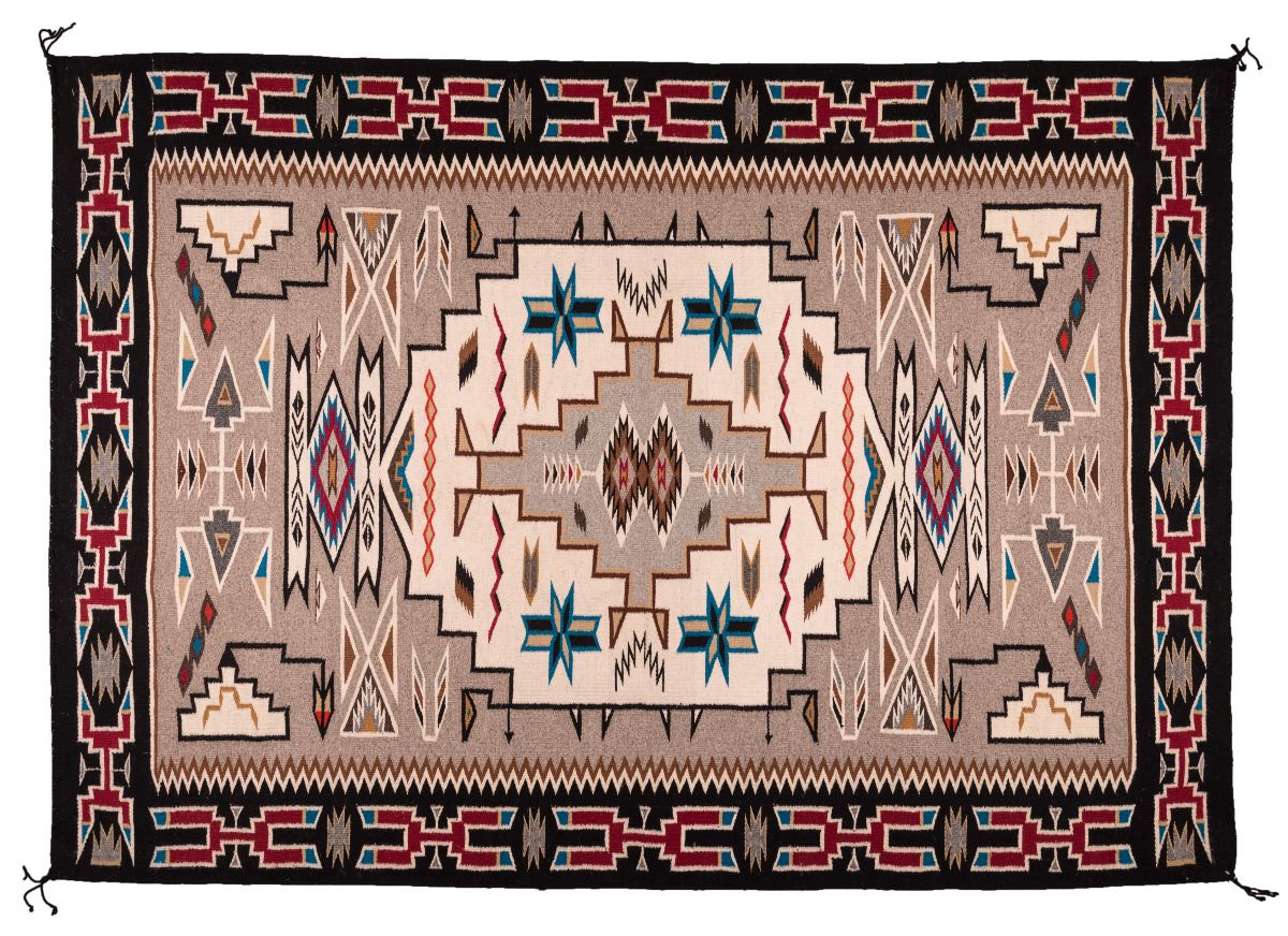 Navajo Weaving. 6'9" x 4'9". Teec Nos Pos Area weaving. Typical eye-dazzling and intricate designs in multiple colors. Circa 1970s.