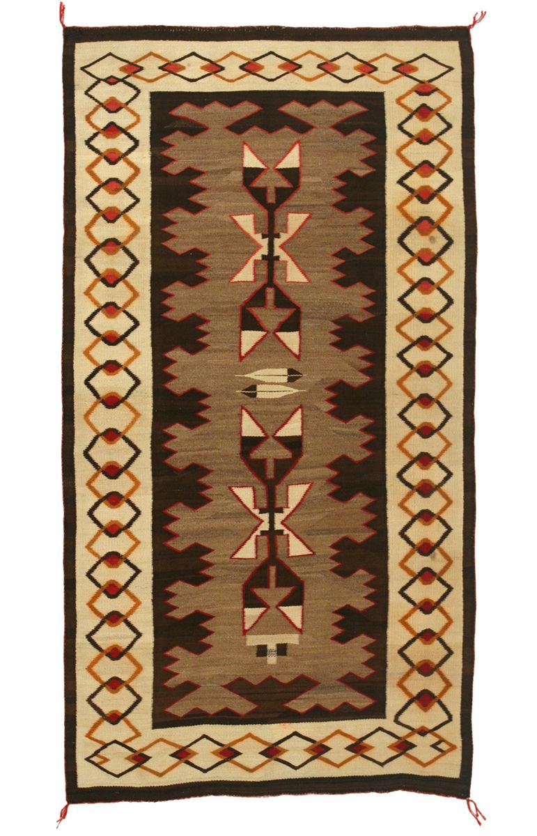 Navajo Weaving. 6' x 3'4". Teec Nos Pos, all Churro wool weaving with a geometrical and reciprocal tulip field design. A linked diamond border makes for a great border. Circa 1920s.
