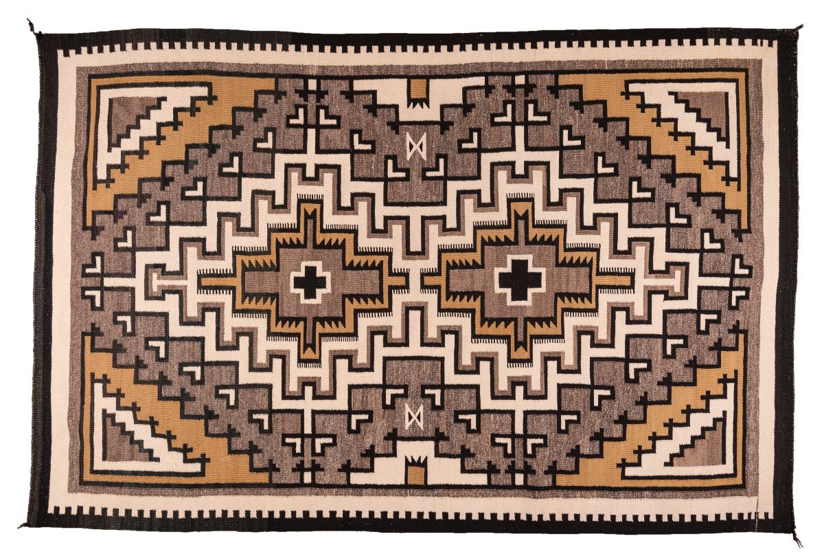 Navajo Weaving. 6' x 4'. A very intricately designed Two Grey Hills weaving with a concentric, double-diamond layout on a beautiful, hand-carded, dark grey field. Small, black and white crosses at the center of each diamond adds a nice touch for a focal point. Woven from all Native, handspun, long-staple, Churro sheep wool on a wool warp. Circa 1940s.