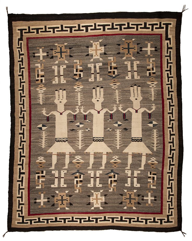 Navajo Weaving. 6' x 5'2". A spectacular pictorial weaving with double rolling log, crosses, Yei elements, and a double "T" border. Circa 1930.