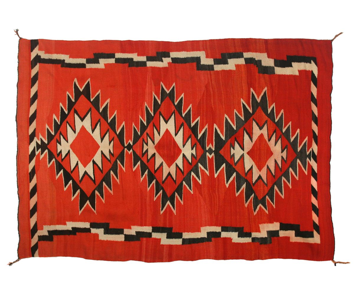 Navajo Transitional Weaving. 7'2" x 5'1". Black and white triple serrated diamond design over a bold red background. Stepped and banded border. Circa 1890's.