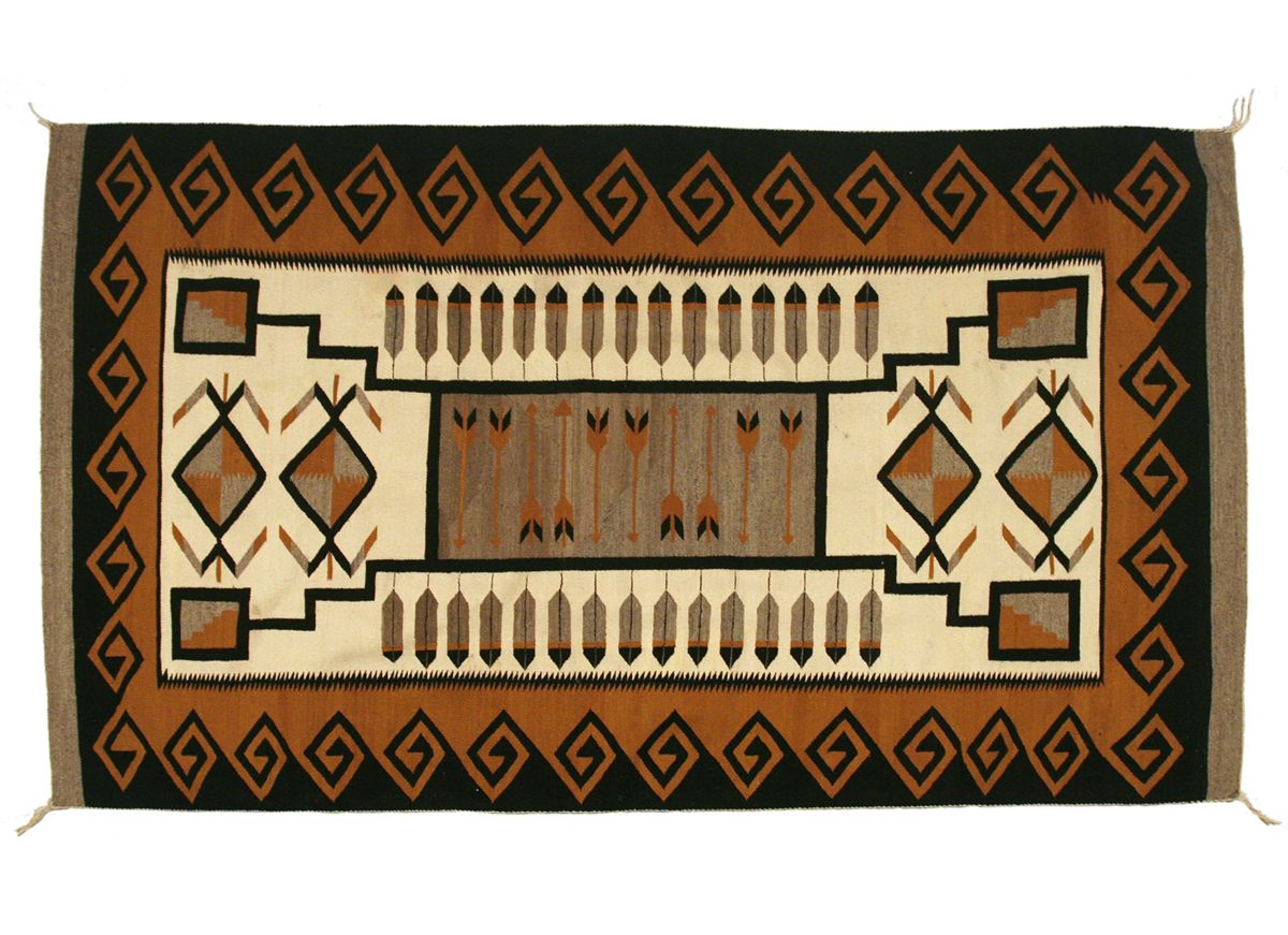 Navajo Weaving. 7'5" x 4'2". Great overall designs inside a Greek key border. Circa 1940s.