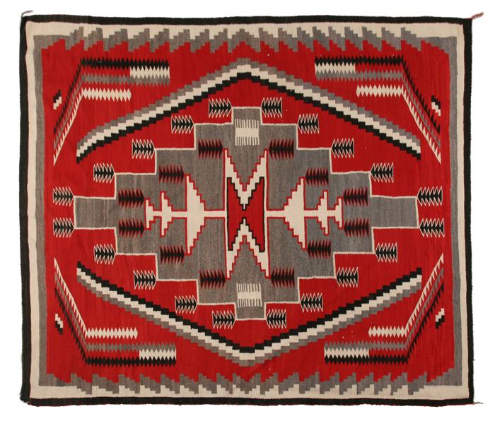 Navajo Weaving. 80" x 60". Red, black and white designs on red field. 1970s. Condition Report: Damage to one corner, missing tassel. Shows old repair. Minor selvage damage.