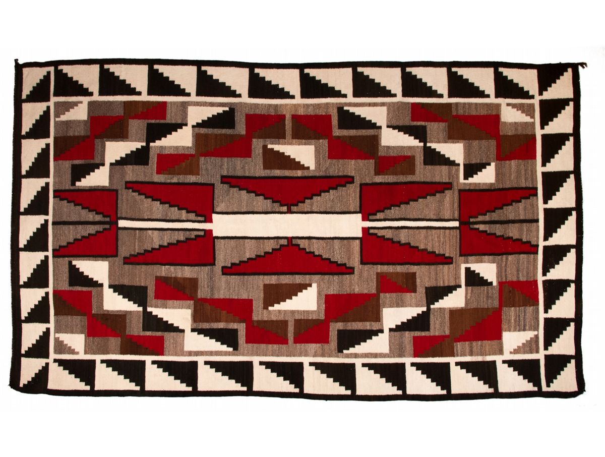 Navajo Weaving. 9'3" x 5'4". Geometrically pleasing Ganado textile in bold shades of red, grey, black and white.