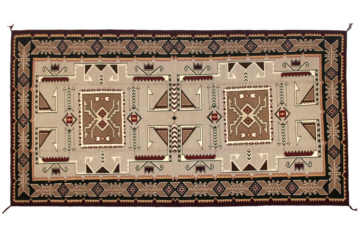 Navajo Weaving. 9'5" x 5'. Teec Nos Pos area. Churro wool. Great quality and size. Elements include water bugs and feathers. Color palette is wonderful. Woven by Cecelia Nez. Last quarter 20th century.