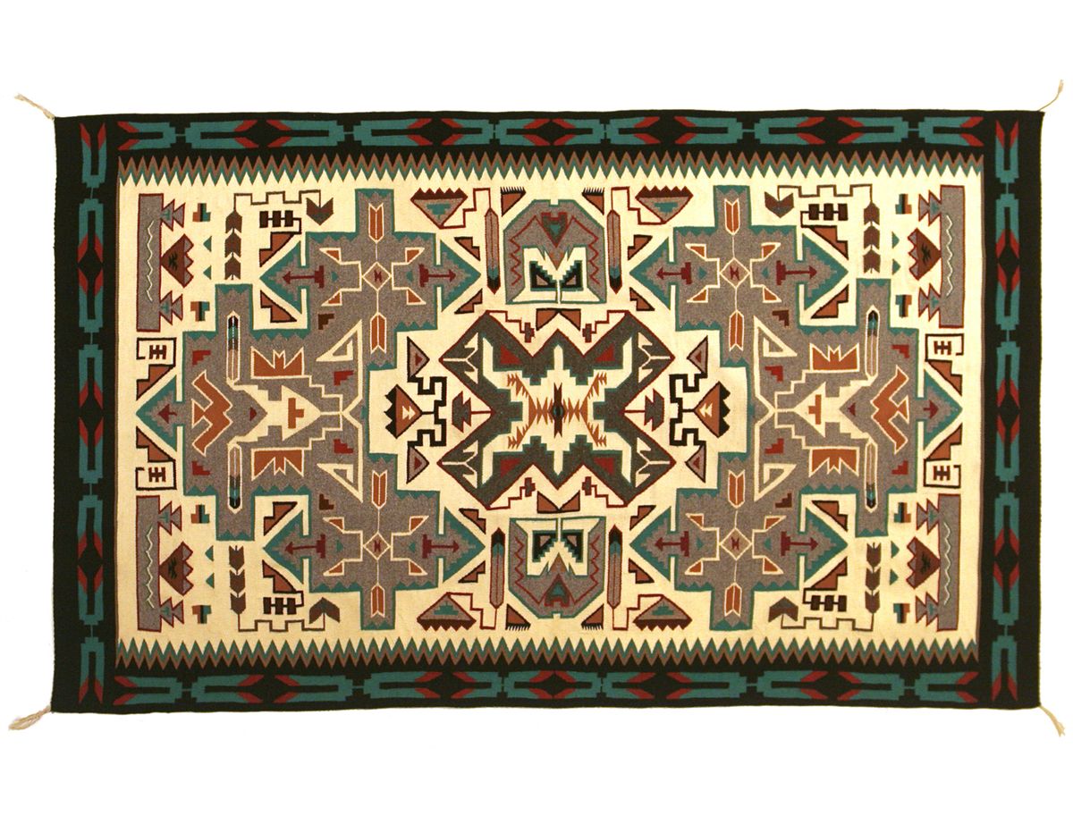 Navajo Weaving. 9'5" x 6'2". Teec Nos Pos area. Classic colors and designs. Extra large size for a Teec rug. Woven by Elsie Begay. 20th century.