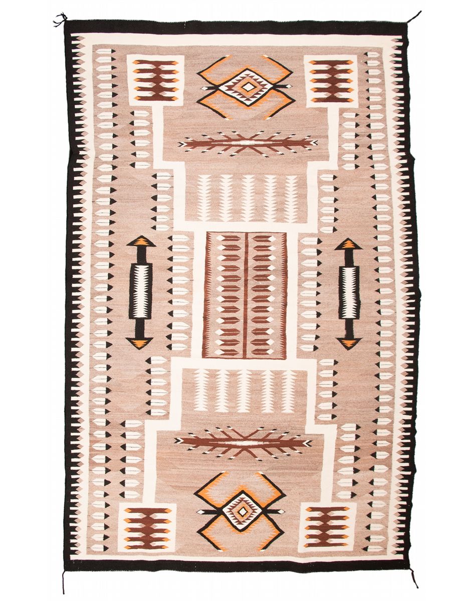 Navajo Weaving. 9' x 5'9". Storm pattern made by Garrett Alcott, White Hills Indian Arts, Camp Verde, AZ. Feather design throughout, including brown feathers in the center. Circa 1920s. Provenance: Purchased from White Hills Indian Arts, Camp Verde, AZ. 1980s.