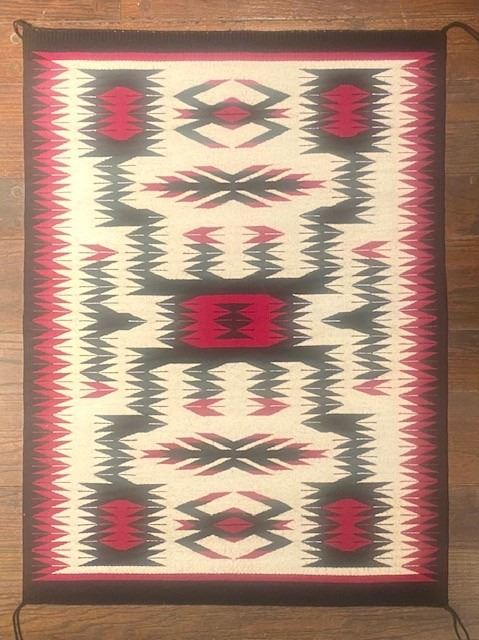 Very Busy Storm Pattern with some very Unique Designs. Wove by Sarah Tisi. Measures 37.25-inches by 27.75-inches.