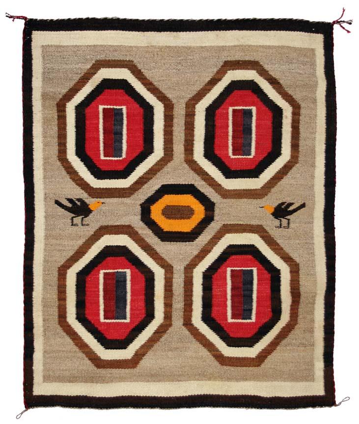 Navajo Weaving. 48" x 39". Uncommon octagonal design, bird pictorial. Woven from all long staple silky Churro wool. Circa 1920s. (est $800-1,600). For condition reports please visit: www.auctioninsantafe.com/cr2011.pdf