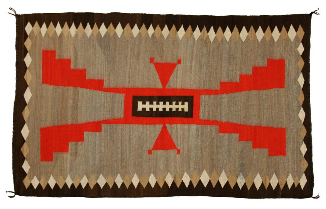 Navajo Weaving, Crystal Trading Post. 73" x 45". Finely woven, stylized storm pattern. Woven from fine old specially cleaned long staple Churro known as "Crystal Wool". Big bold design with linked diamond border. Circa 1910-1920. (est $1,800-2,500). For condition reports please visit: www.auctioninsantafe.com/cr2011.pdf