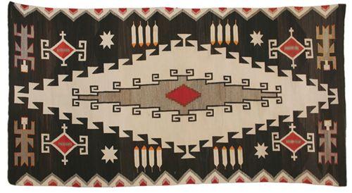 Navajo Weaving. Teec Nos Pas Area. 68" x 133". Fabulous weaving showing Yei figures, feathers, stars and other design elements. (est $8,000-10,000).