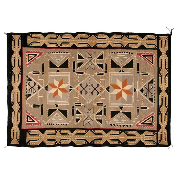 Navajo Weaving, Teec Nos Pos Area. 88 1/2" x 61 1/2". Natural grays, blacks and browns. Star designs and stylized figural border. tars. Fine condition (est $6,000-8,000)