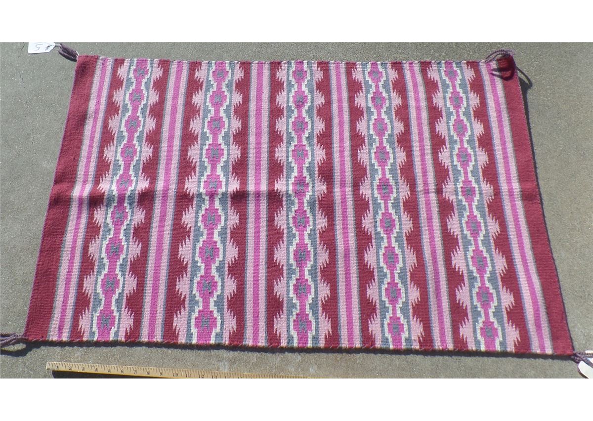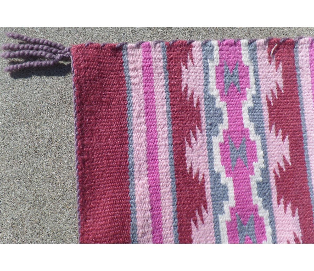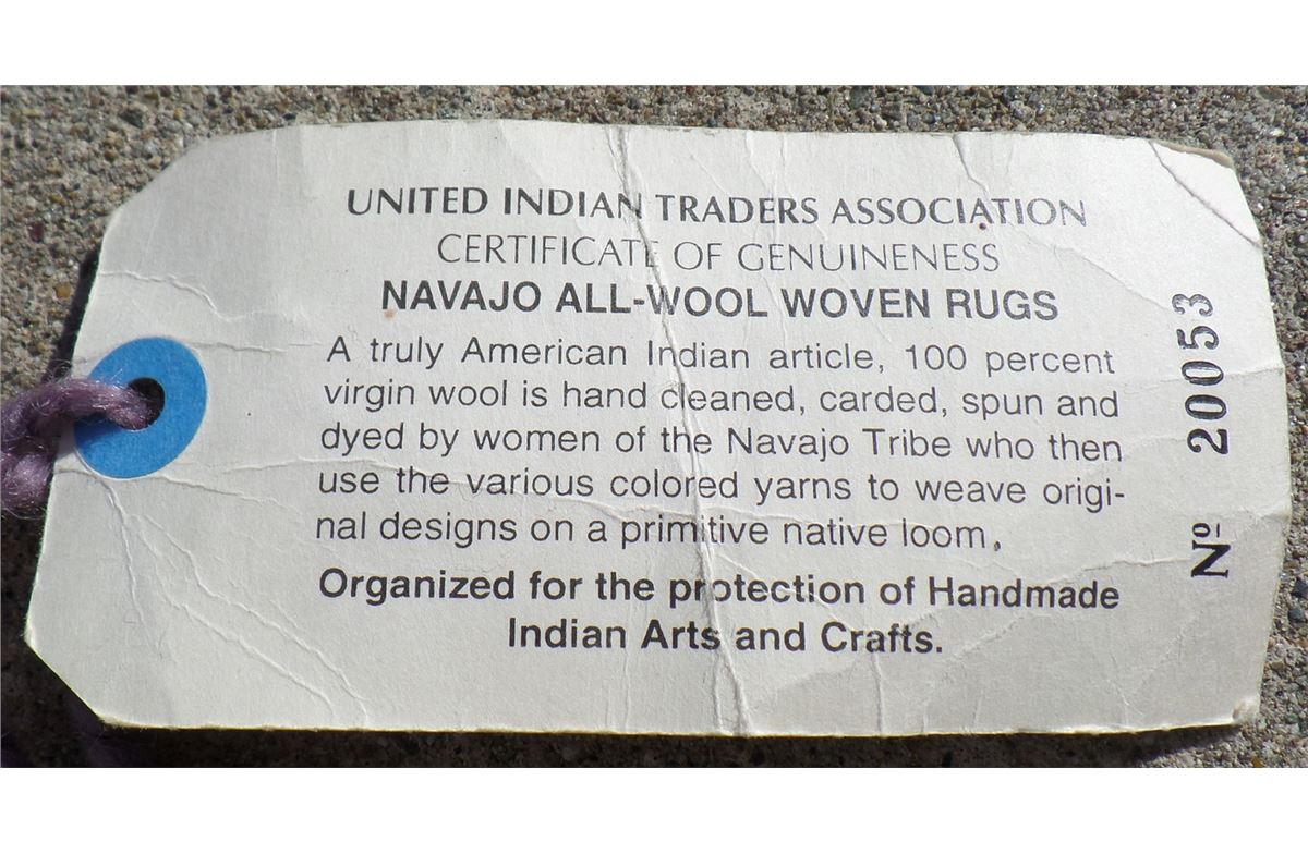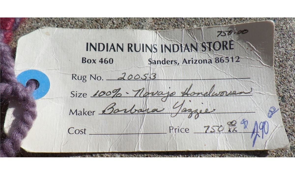 Navajo weaving from the 1950's which measures 28 x 43 inches. The weaver is Barb Yazzie and rug still has original tag from Indian ruins Indian Store. This item is from Sanders, Arizona. Condition: Great investment quality rug with one broken string on one corner. Shipping $26.00