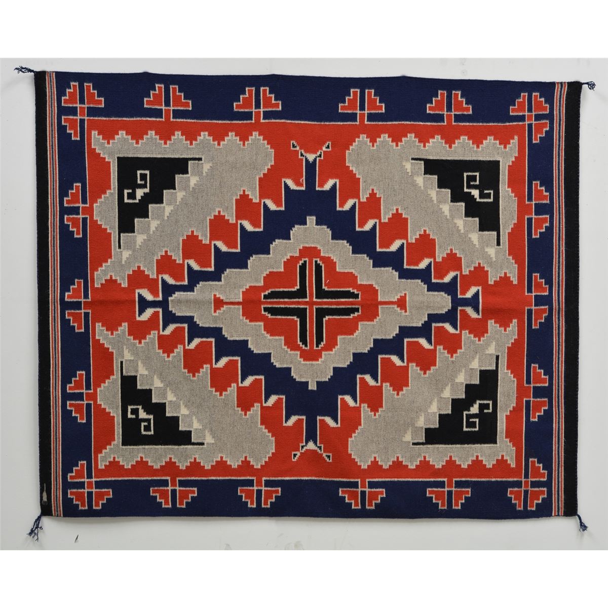 Navajo rug with atypical design in bright colors of red, white (natural) and blue. Aniline dyes, heavy wool, native-spun with mohair. Weavers mark woven in corner. Circa later 20th century, 71" x 58".