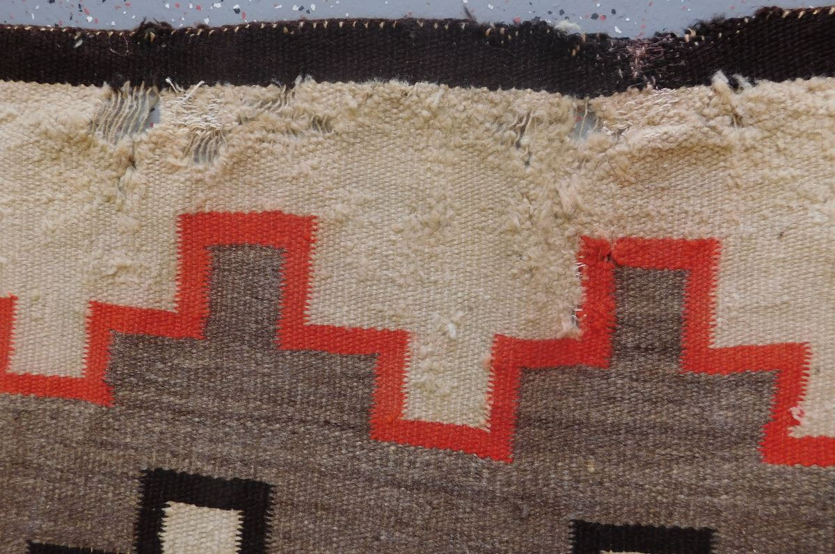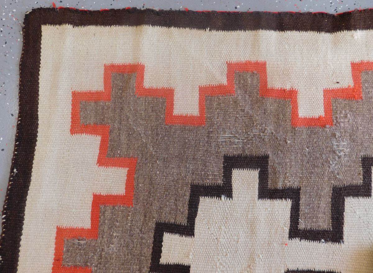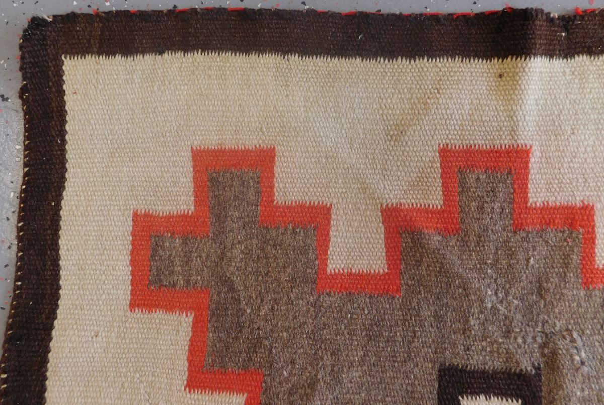 Navajo Weaving, circa 1920s. Item measures 79" x 52" and is made of wool. Navajo, New Mexico. Condition: Item has serious damage, needs repair, has cross design, see images. Shipping: $36.50.