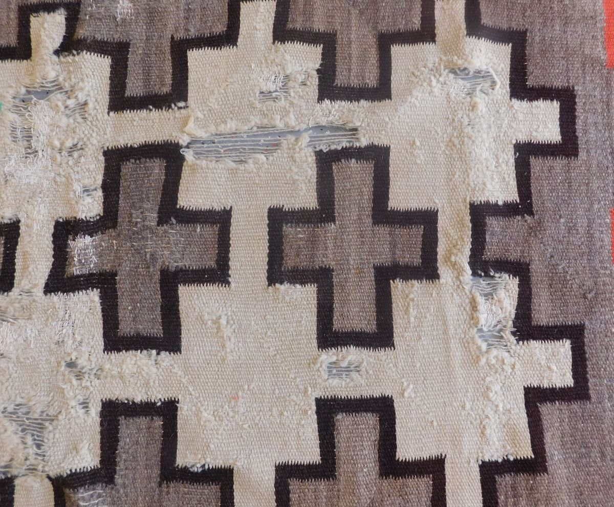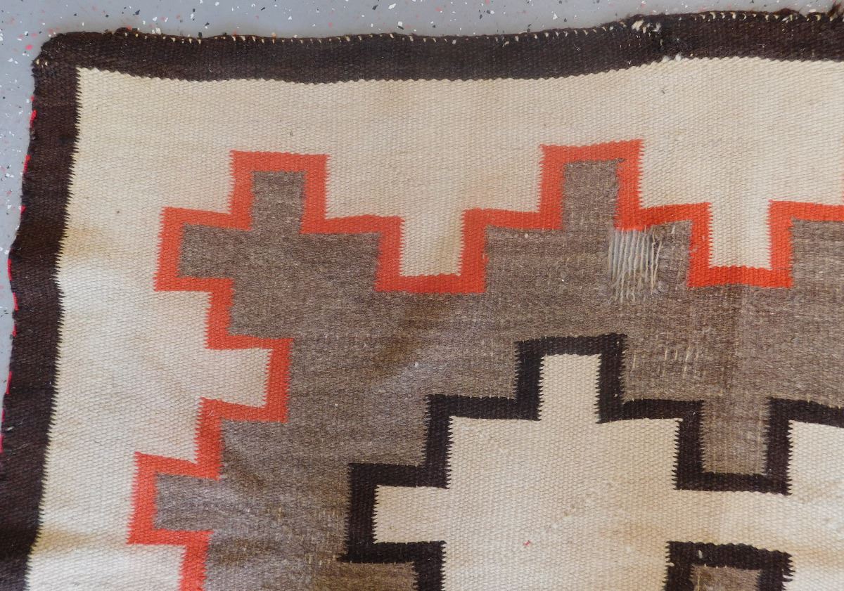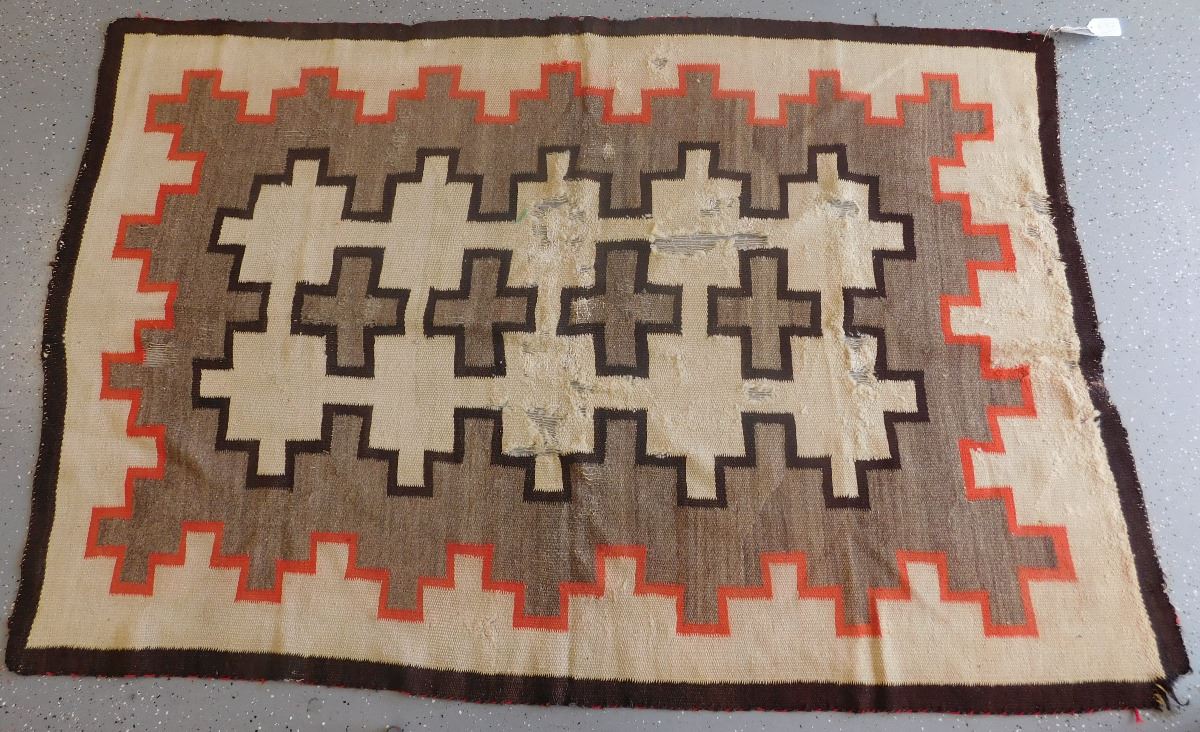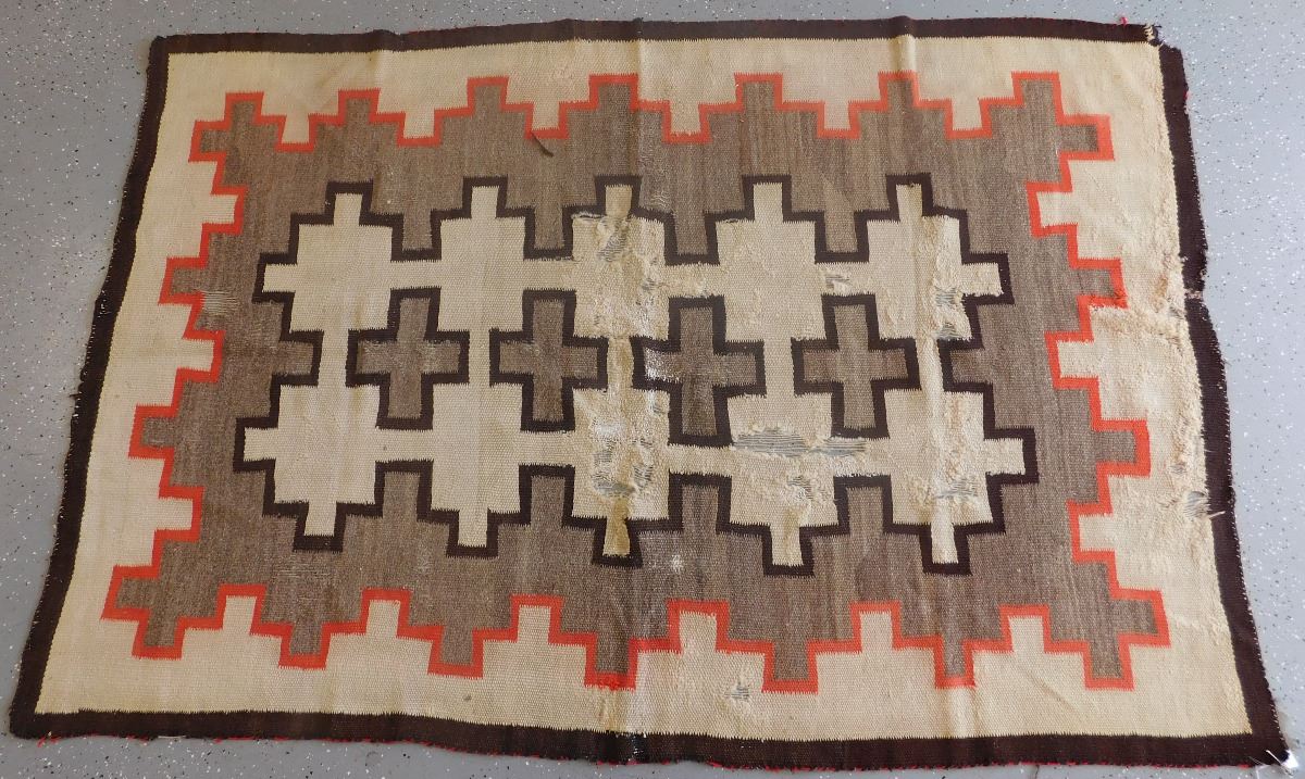 Navajo Weaving, circa 1920s. Item measures 79" x 52" and is made of wool. Navajo, New Mexico. Condition: Item has serious damage, needs repair, has cross design, see images. Shipping: $36.50.