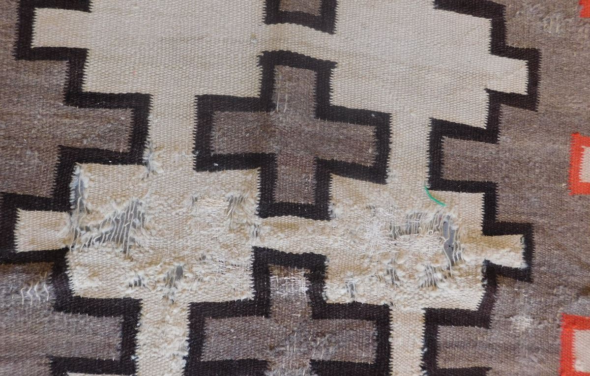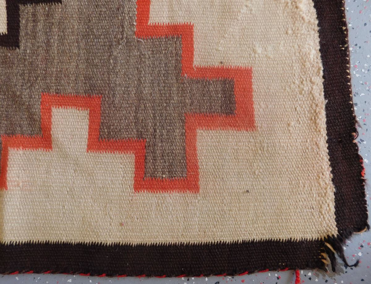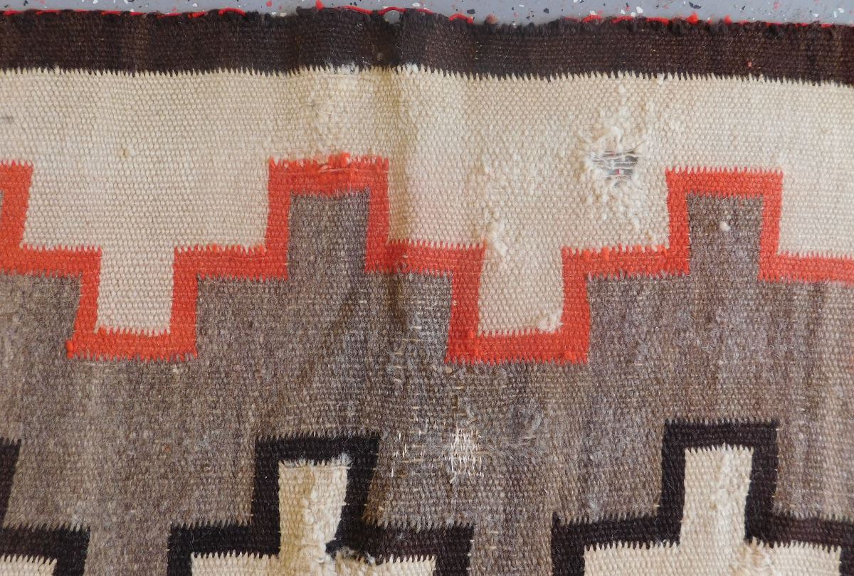 Navajo Weaving, circa 1920s. Item measures 79" x 52" and is made of wool. Navajo, New Mexico. Condition: Item has serious damage, needs repair, has cross design, see images. Shipping: $36.50.