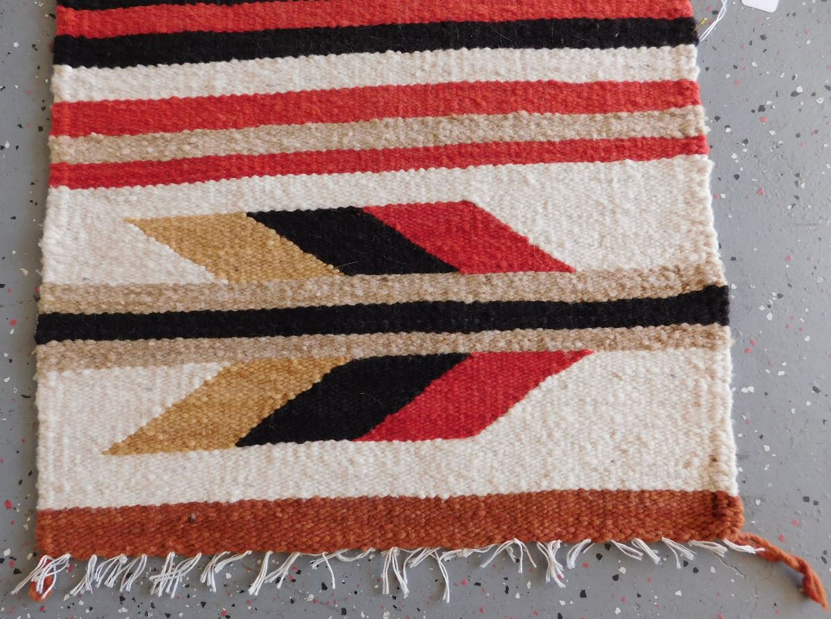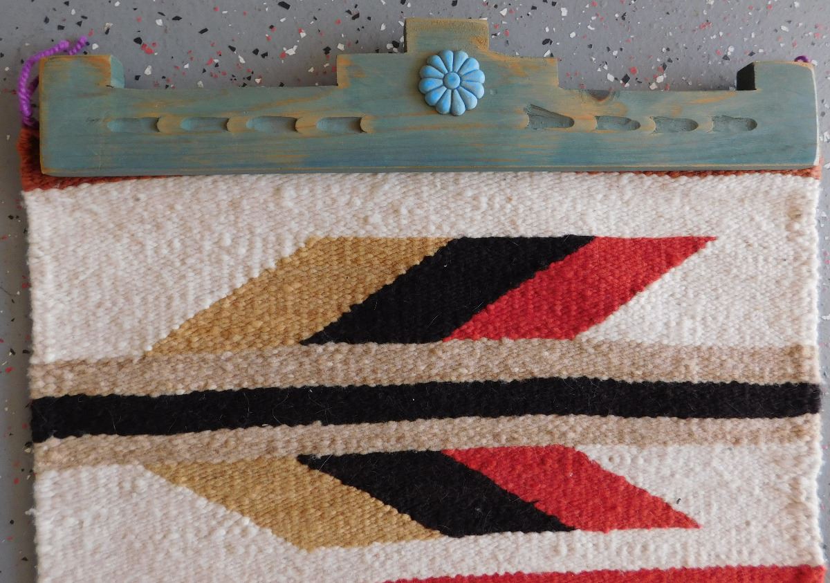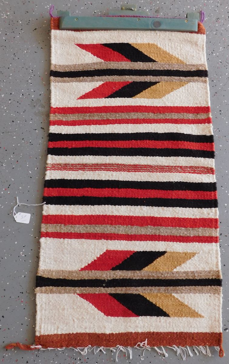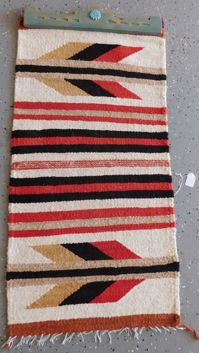 Navajo Weaving, circa 1950s. Made of wool and dye, this item measures 20" x 33". Gallup, New Mexico. Has wood hanger, arrow and feather design. Condition: Good, see images. Shipping: $30.00.