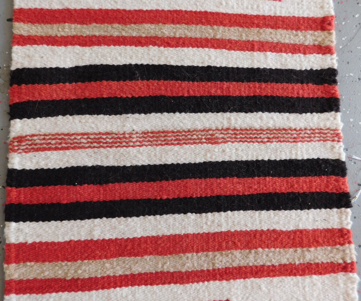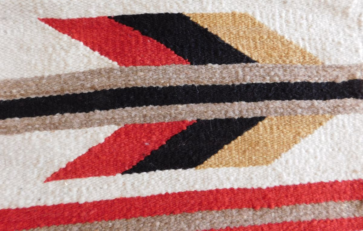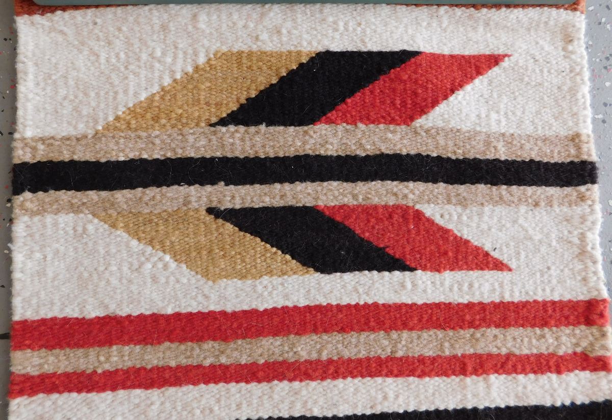 Navajo Weaving, circa 1950s. Made of wool and dye, this item measures 20" x 33". Gallup, New Mexico. Has wood hanger, arrow and feather design. Condition: Good, see images. Shipping: $30.00.