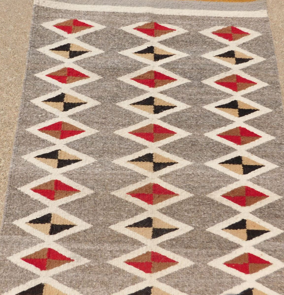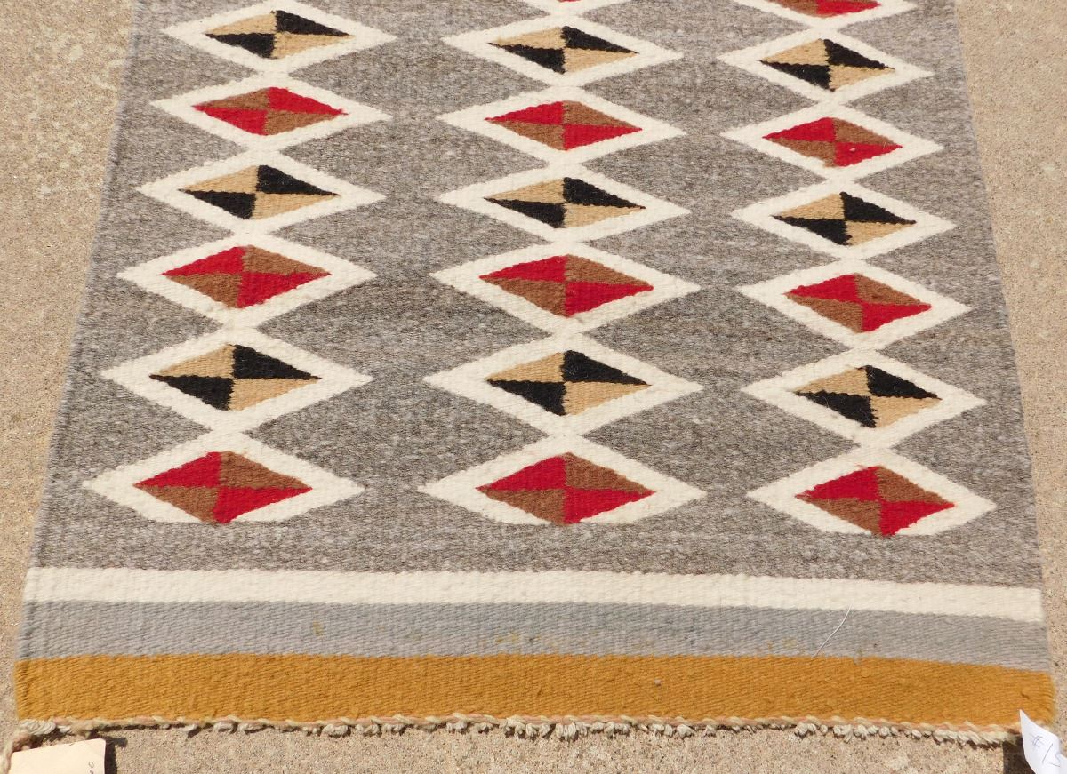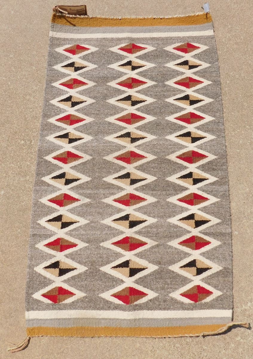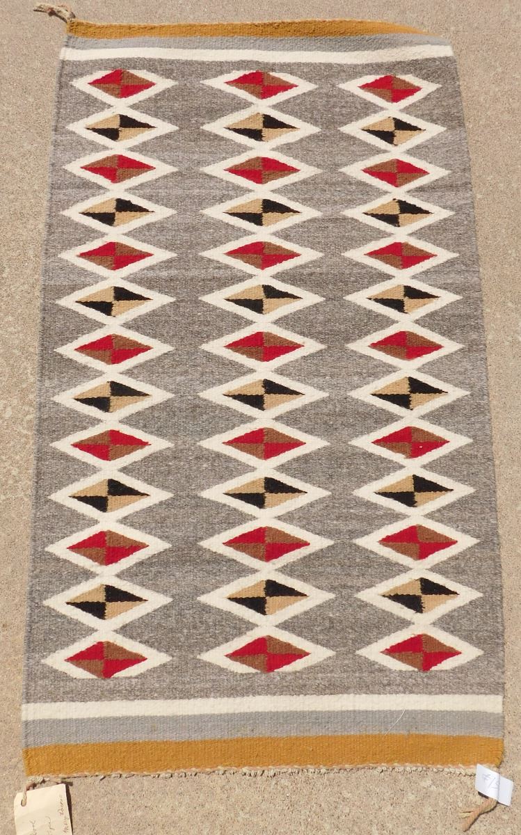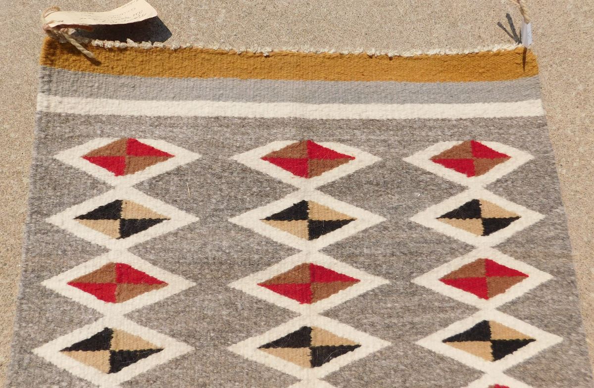 Navajo Weaving, circa 1960s. Made of wool and measuring 37" x 24". Navajo, from New Mexico. Burlingame Gallery. Nice crystal weaving. Conditoin: Good, see images. Shipping: $30.00