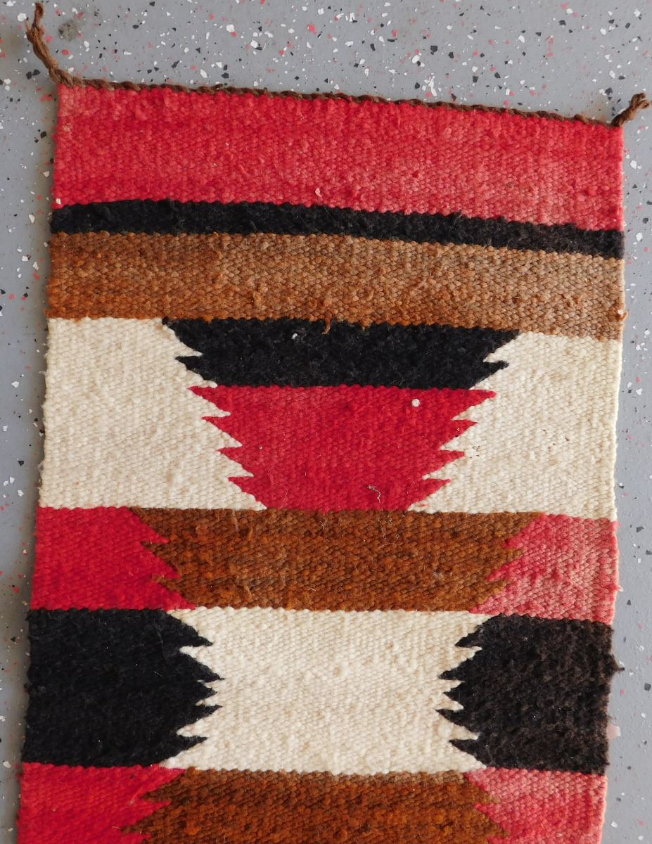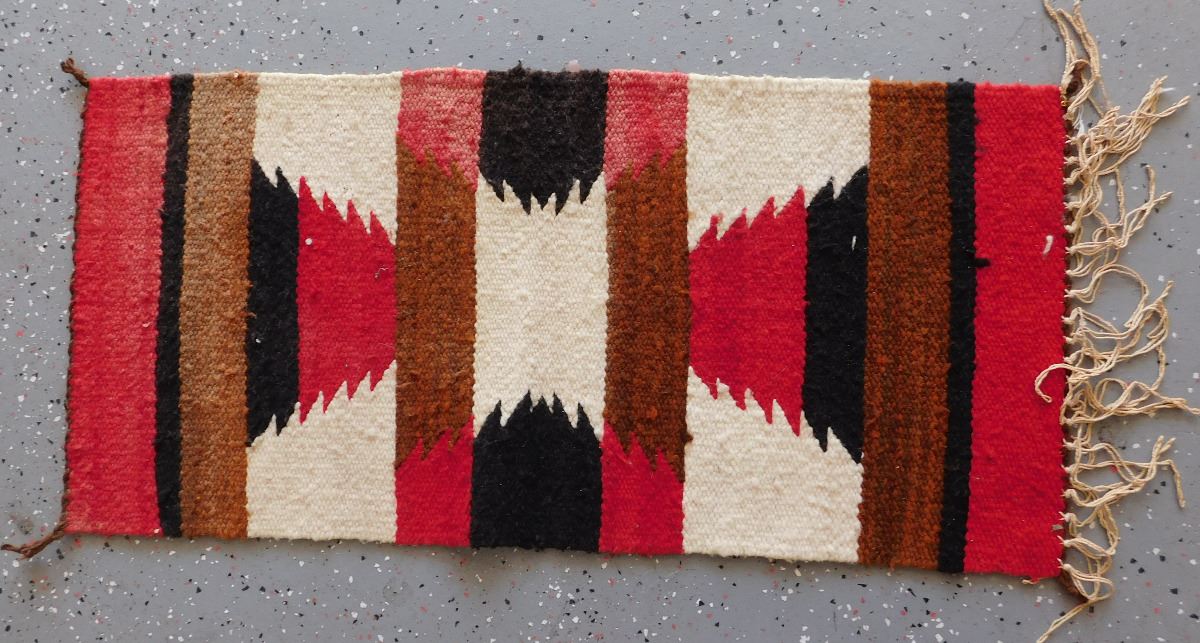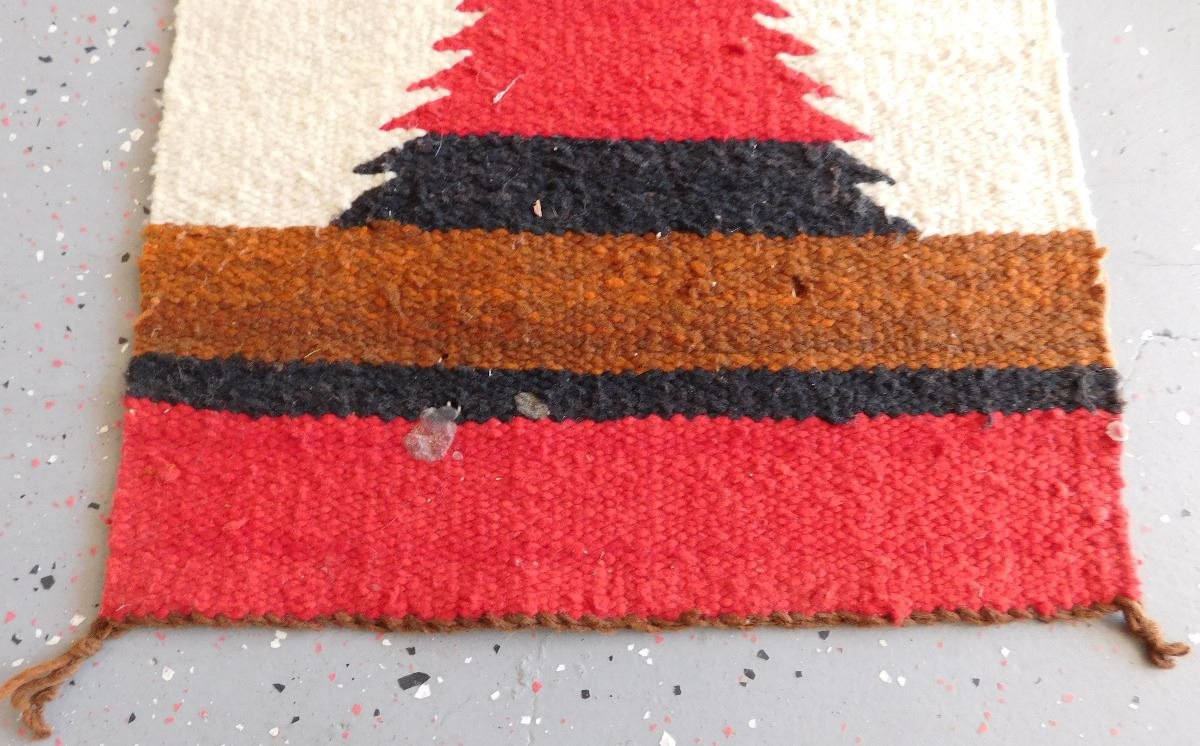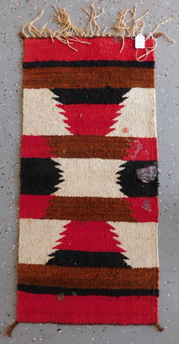Navajo Weaving, circa 1950s. Made of wool and dye, this item measures 37" x 15.5" w/fringe. Gallup, New Mexico. Classic Gallup throw. Condition: Some candle wax on rug, see images. Shipping: $30.00