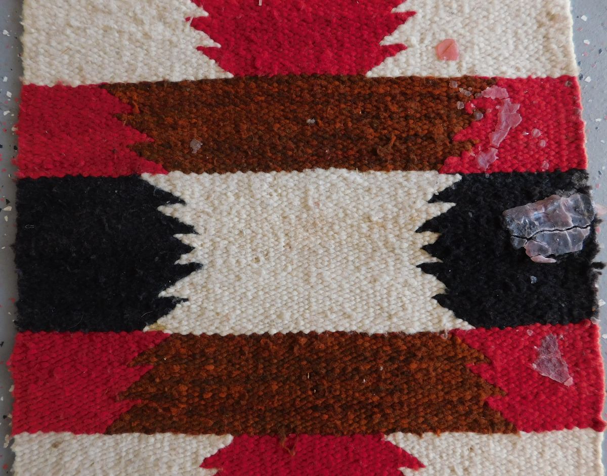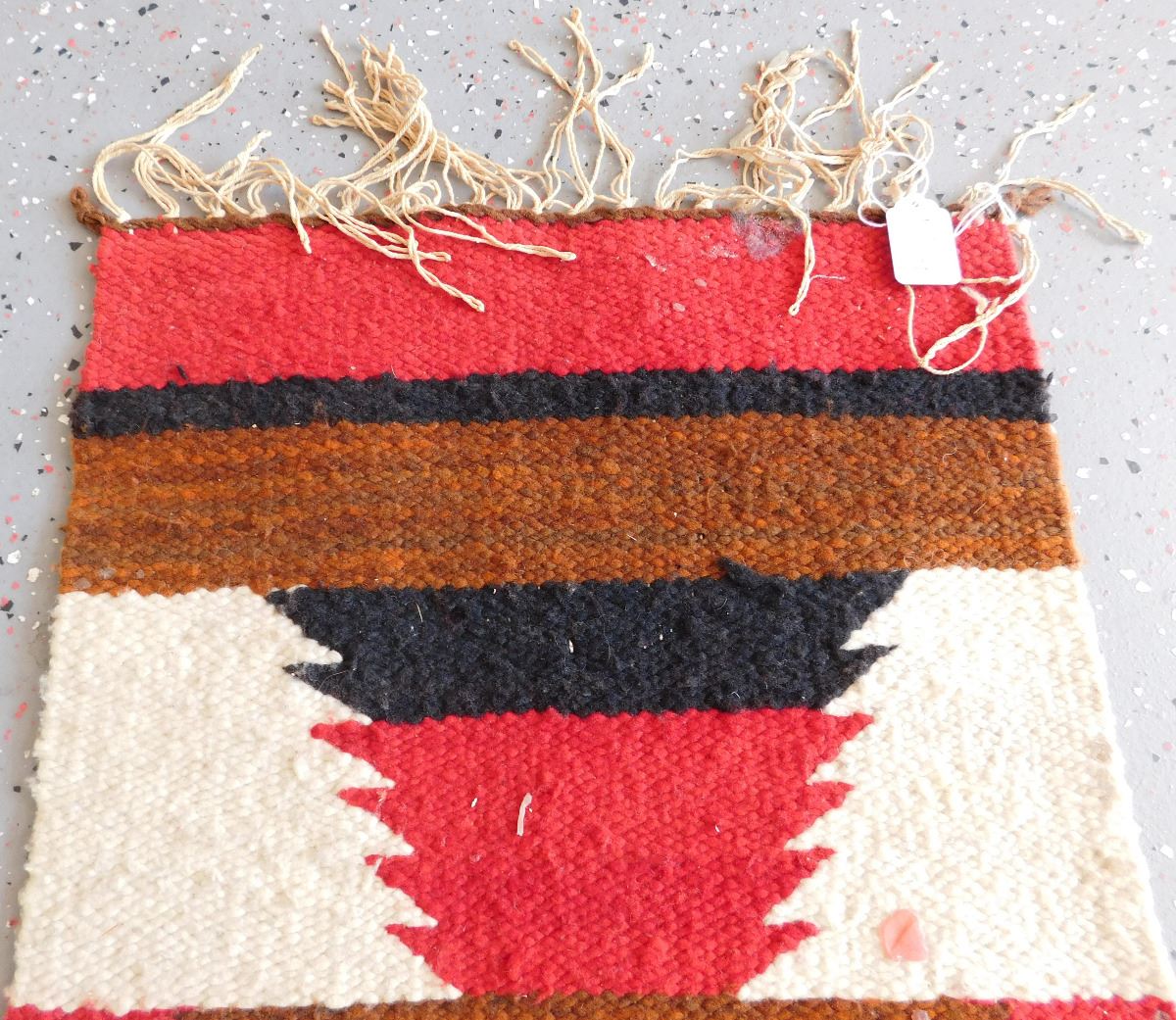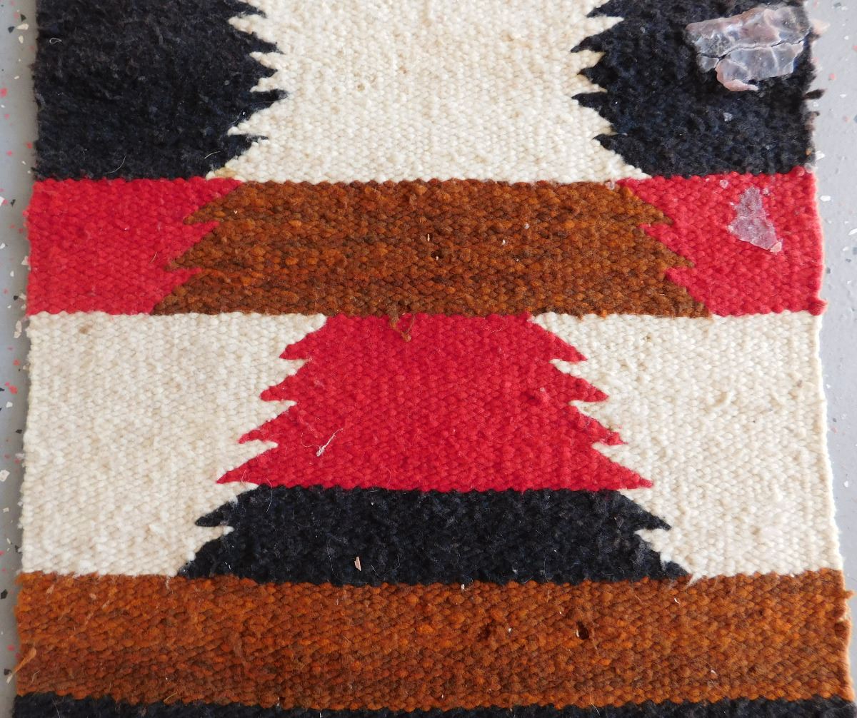 Navajo Weaving, circa 1950s. Made of wool and dye, this item measures 37" x 15.5" w/fringe. Gallup, New Mexico. Classic Gallup throw. Condition: Some candle wax on rug, see images. Shipping: $30.00