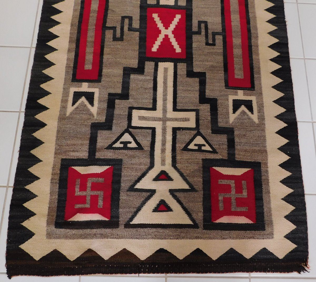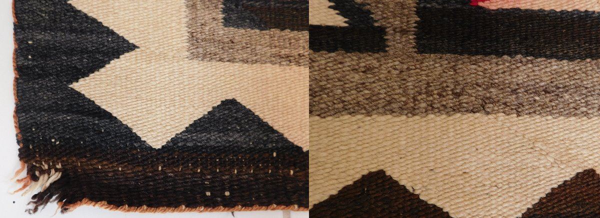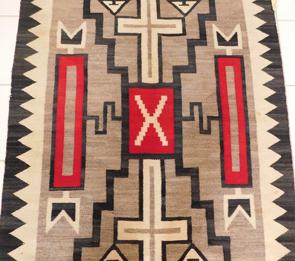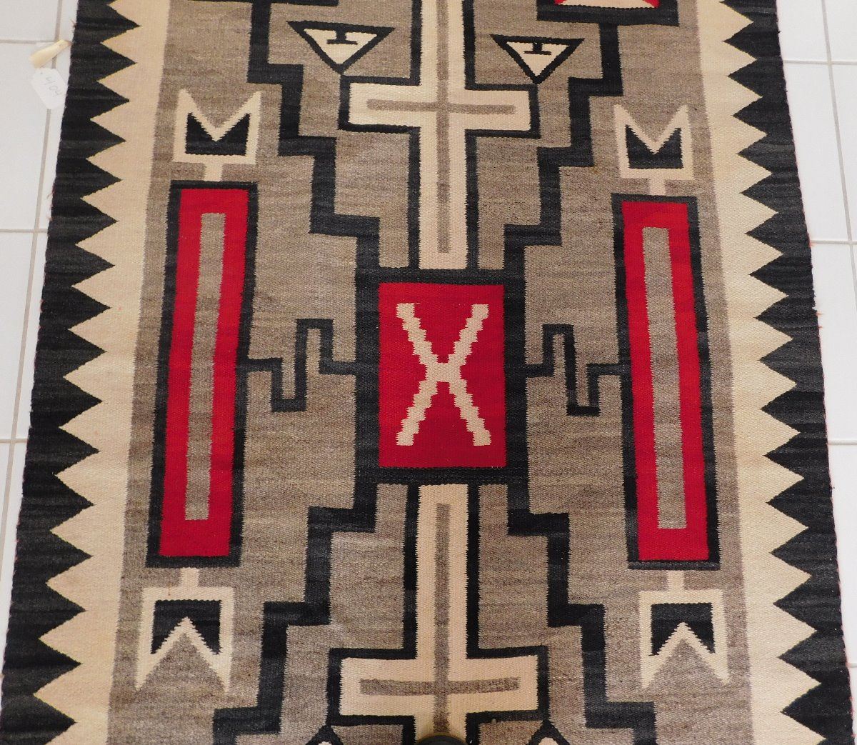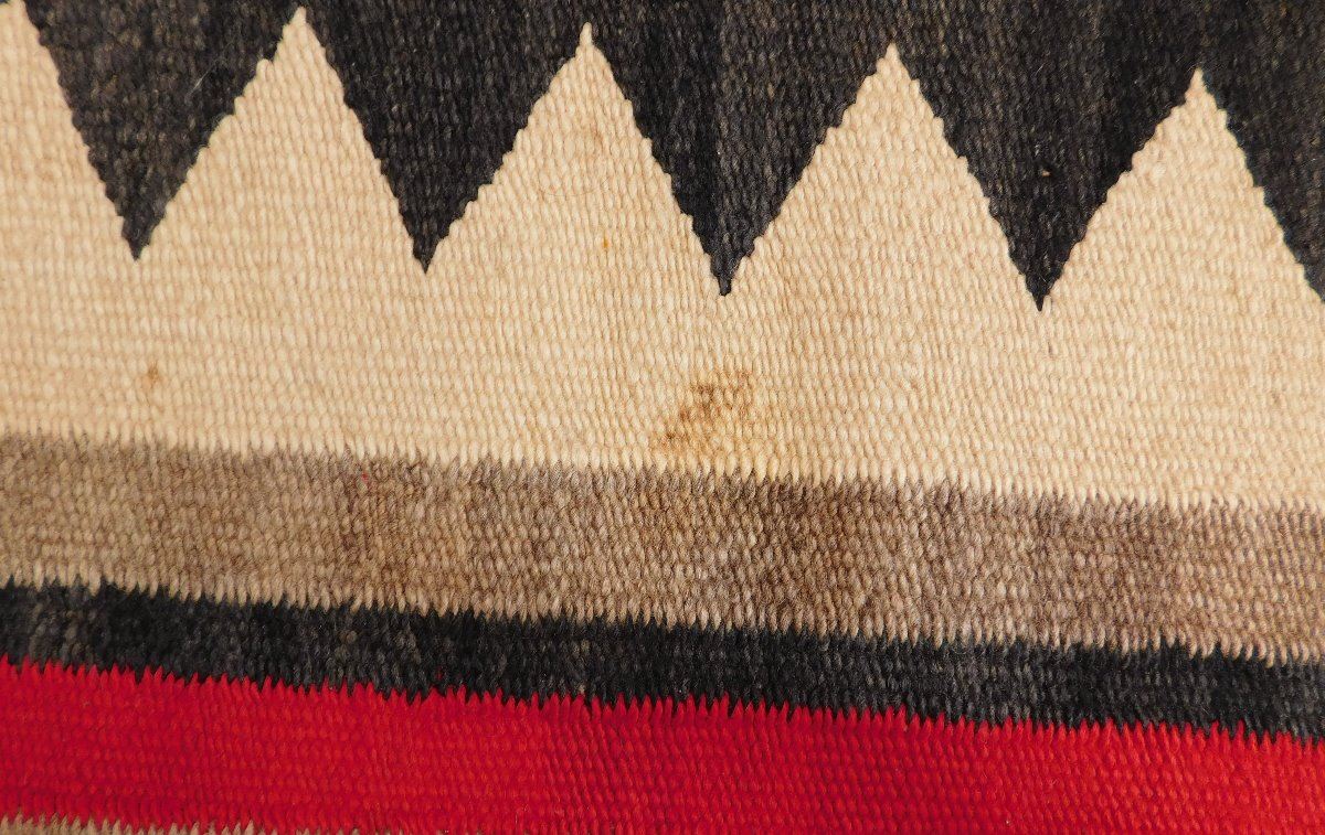 Navajo Weaving, circa 1930s. Made of wool and dye, the item is 78.5" long x 44.5" wide. Navajo. Condition: Good, minor corner damage and staining, see images. Shipping: $40.00 w/insurance and signature, due to size and weight.