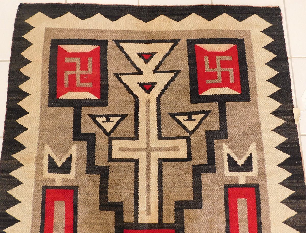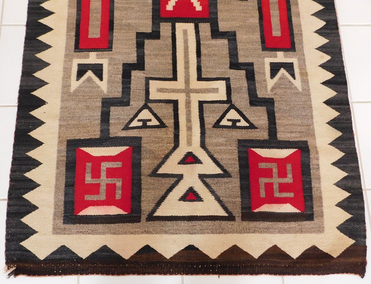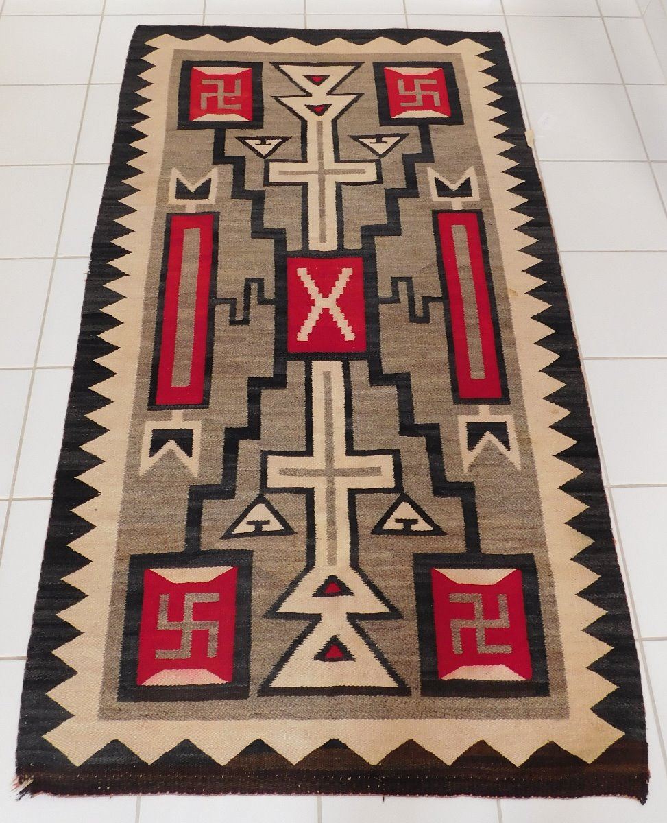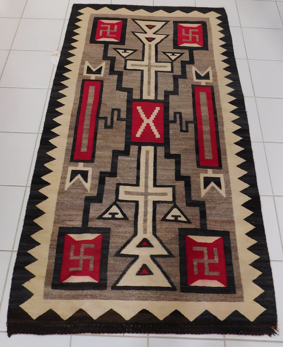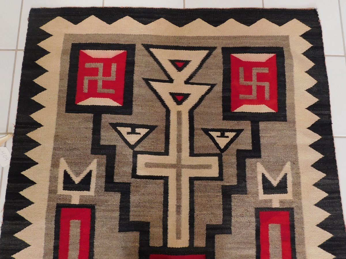 Navajo Weaving, circa 1930s. Made of wool and dye, the item is 78.5" long x 44.5" wide. Navajo. Condition: Good, minor corner damage and staining, see images. Shipping: $40.00 w/insurance and signature, due to size and weight.