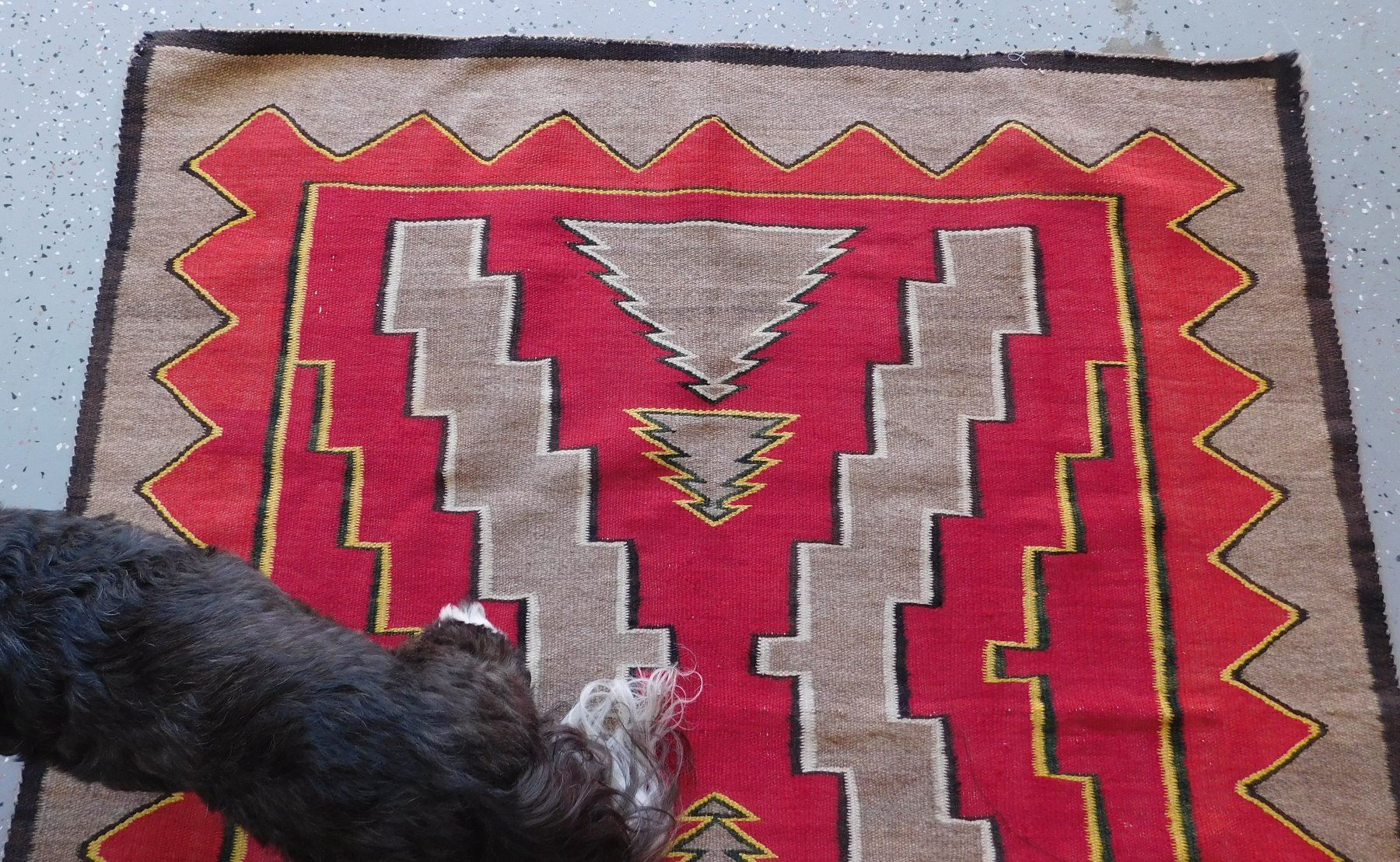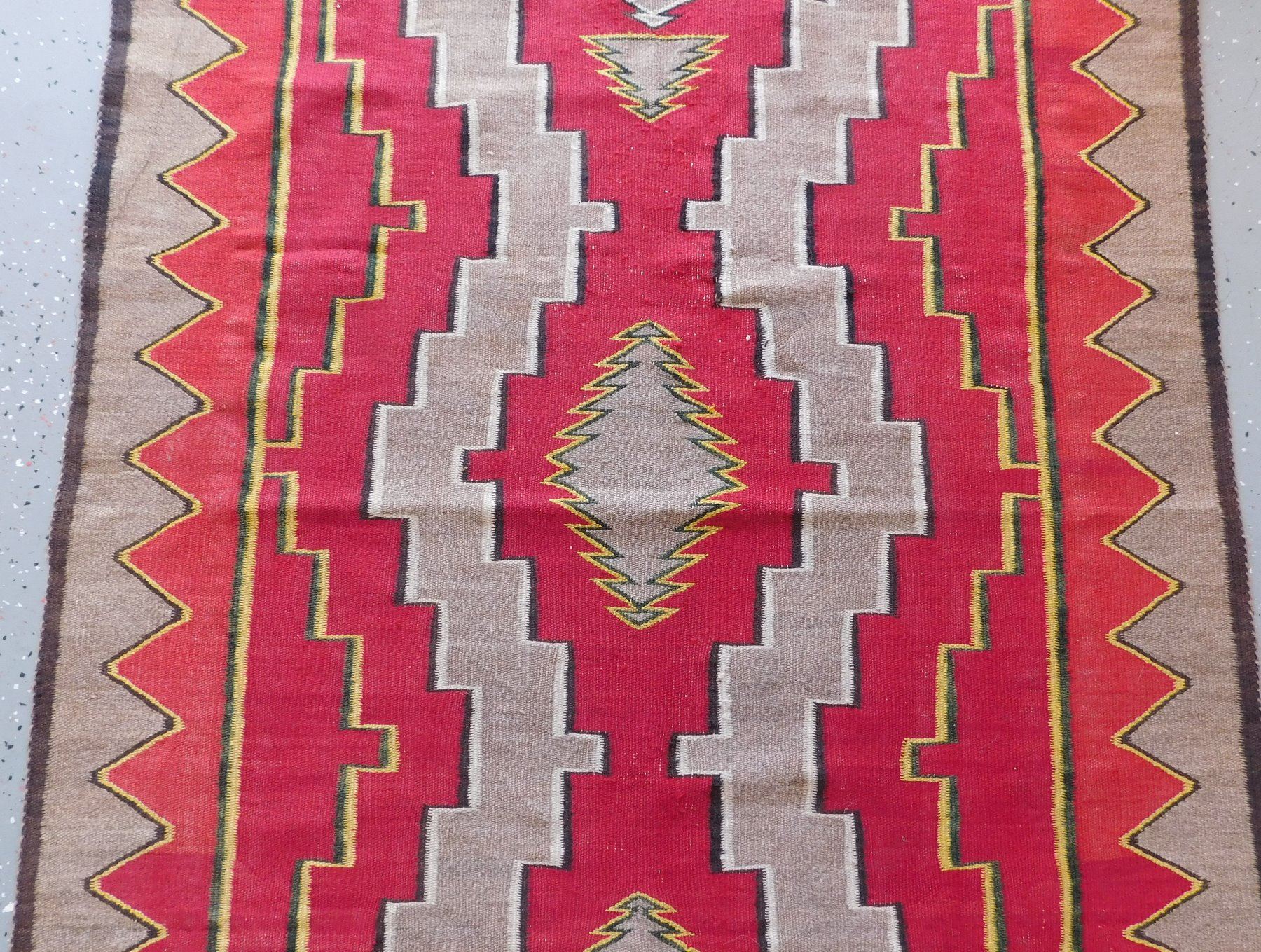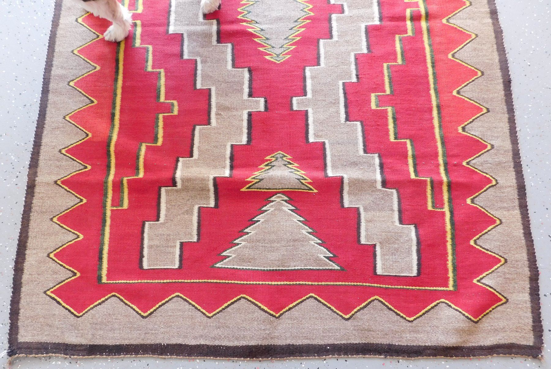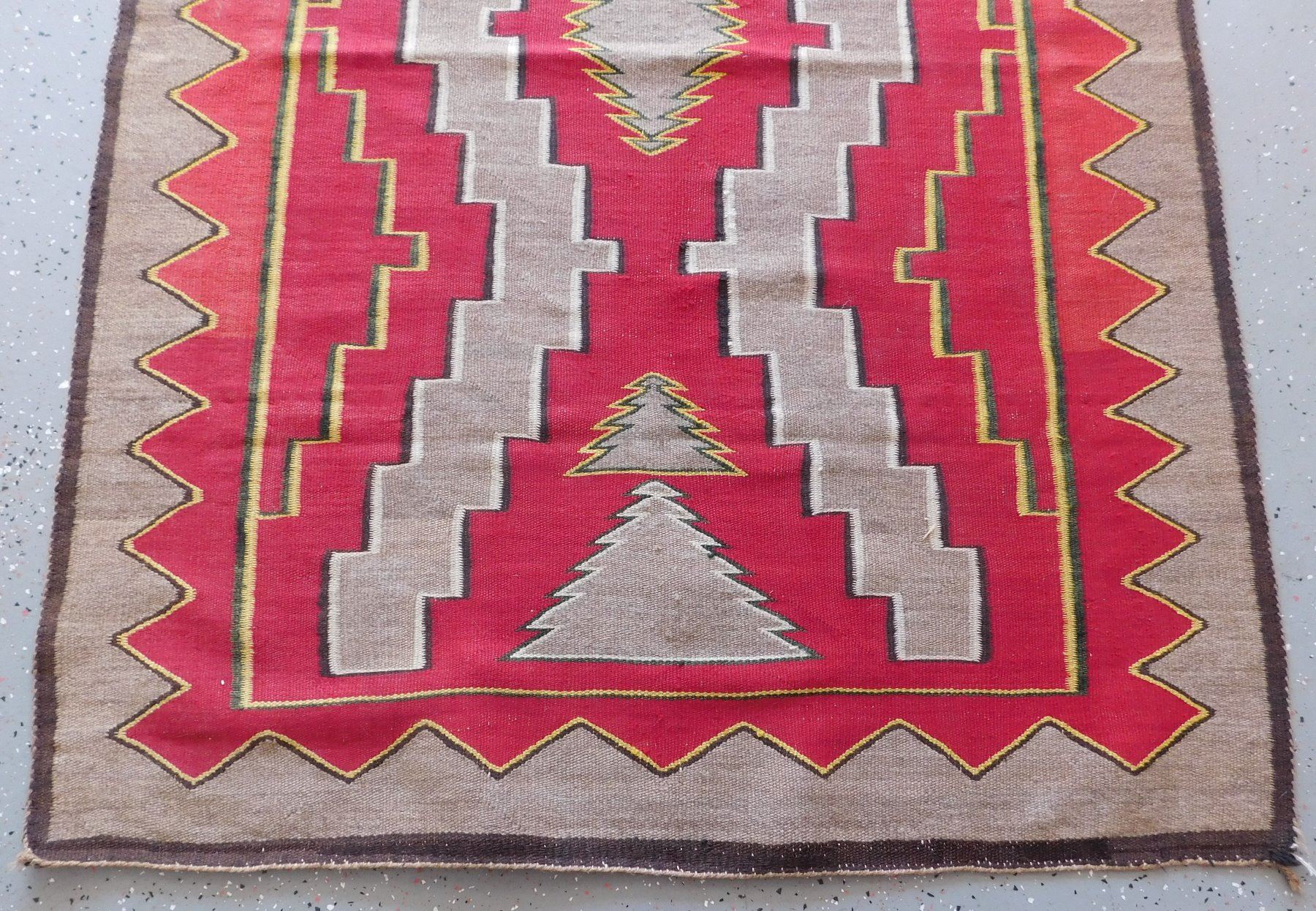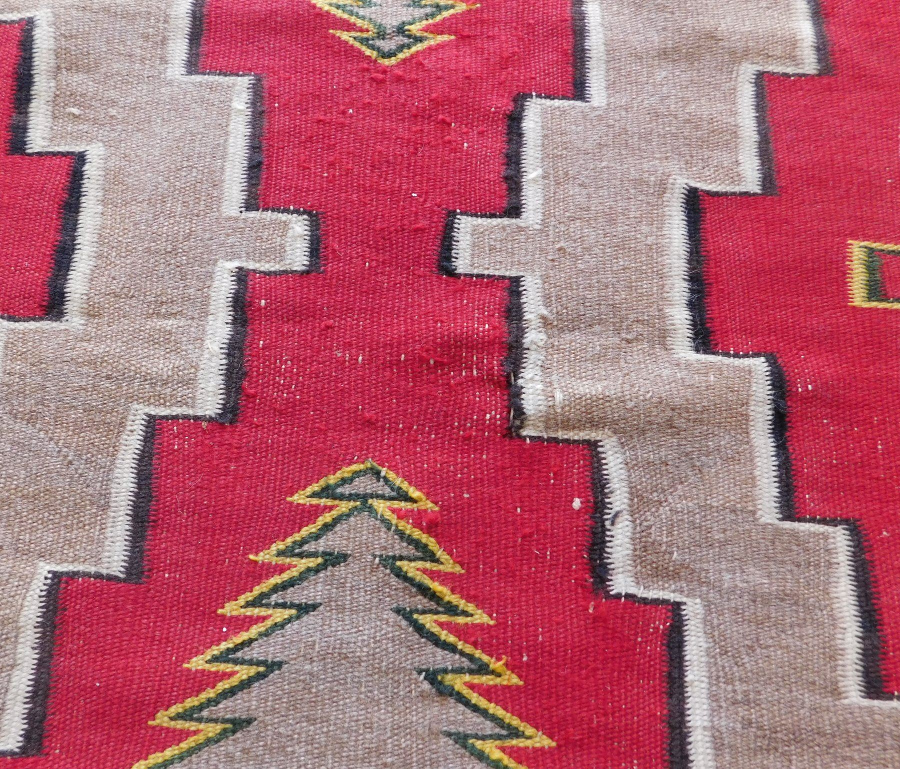 Navajo Weaving, c. 1930s. Made of wool and dye, the item measures 63" x 45". New Mexico. Appears to be either a Ganado or a Red Mesa weaving. Condition: Minor holes, see images. Shipping: $26.50 w/insurance and signature.