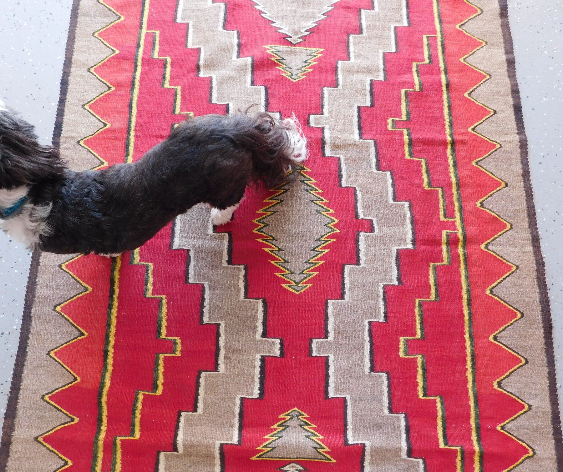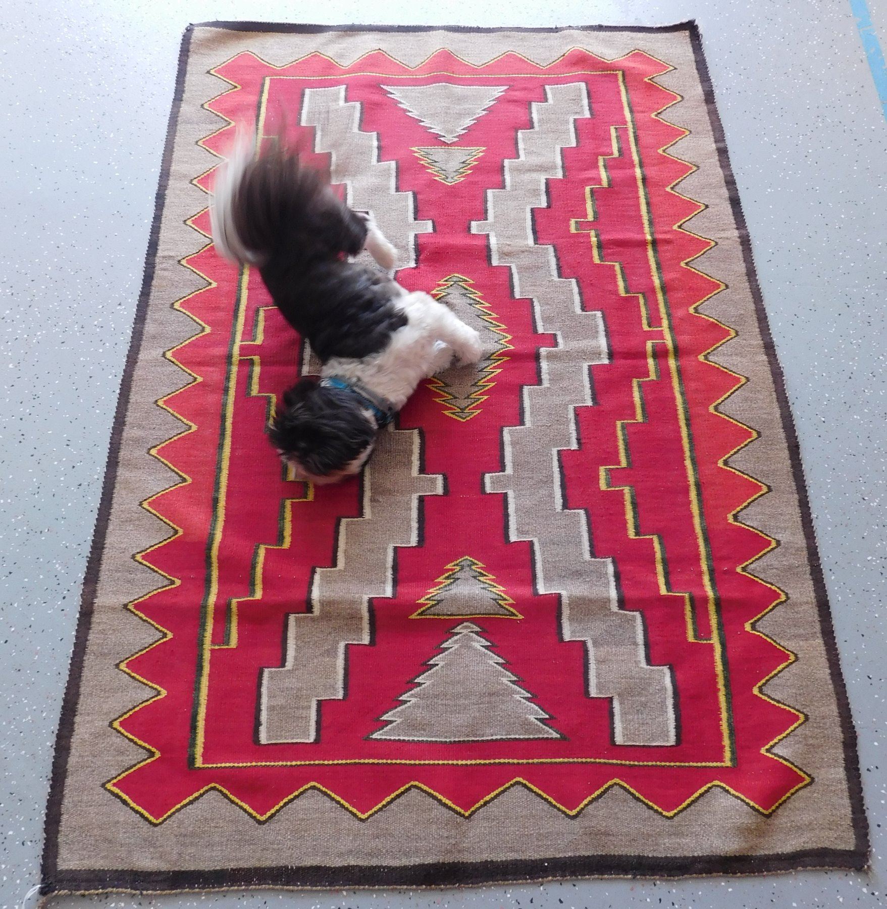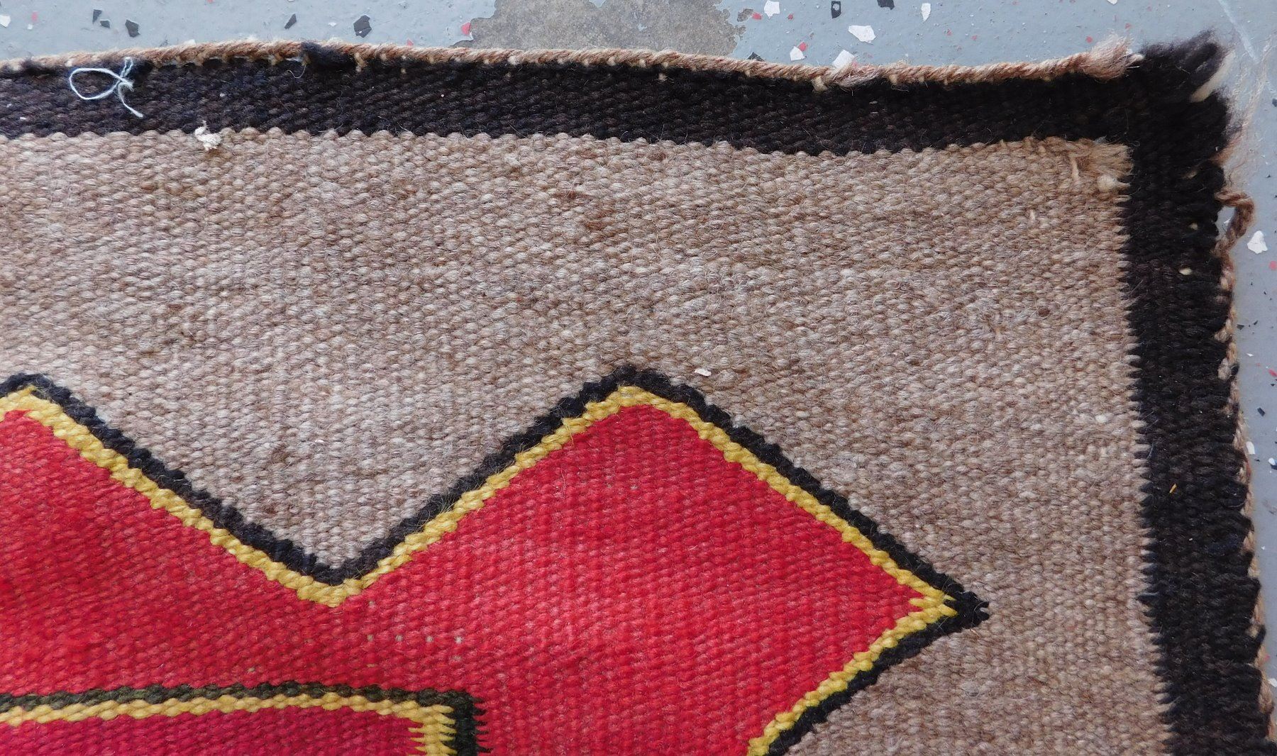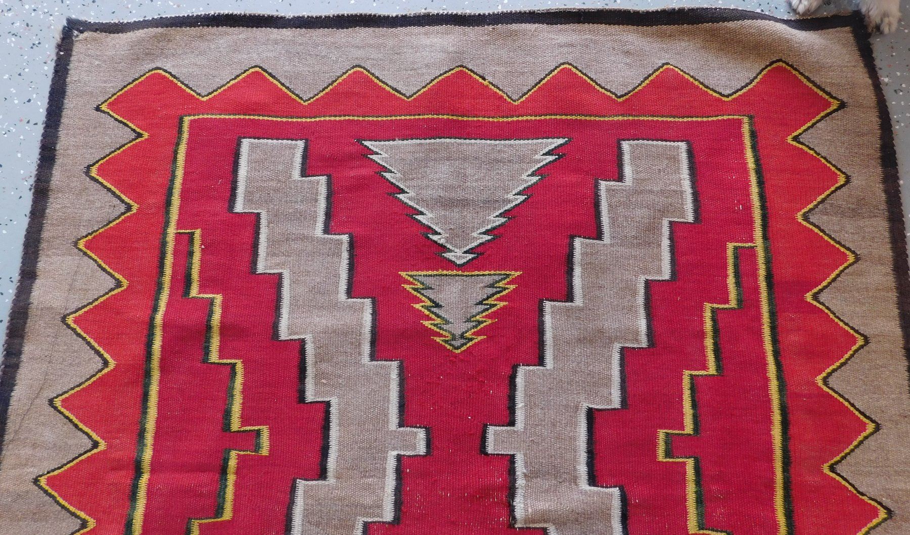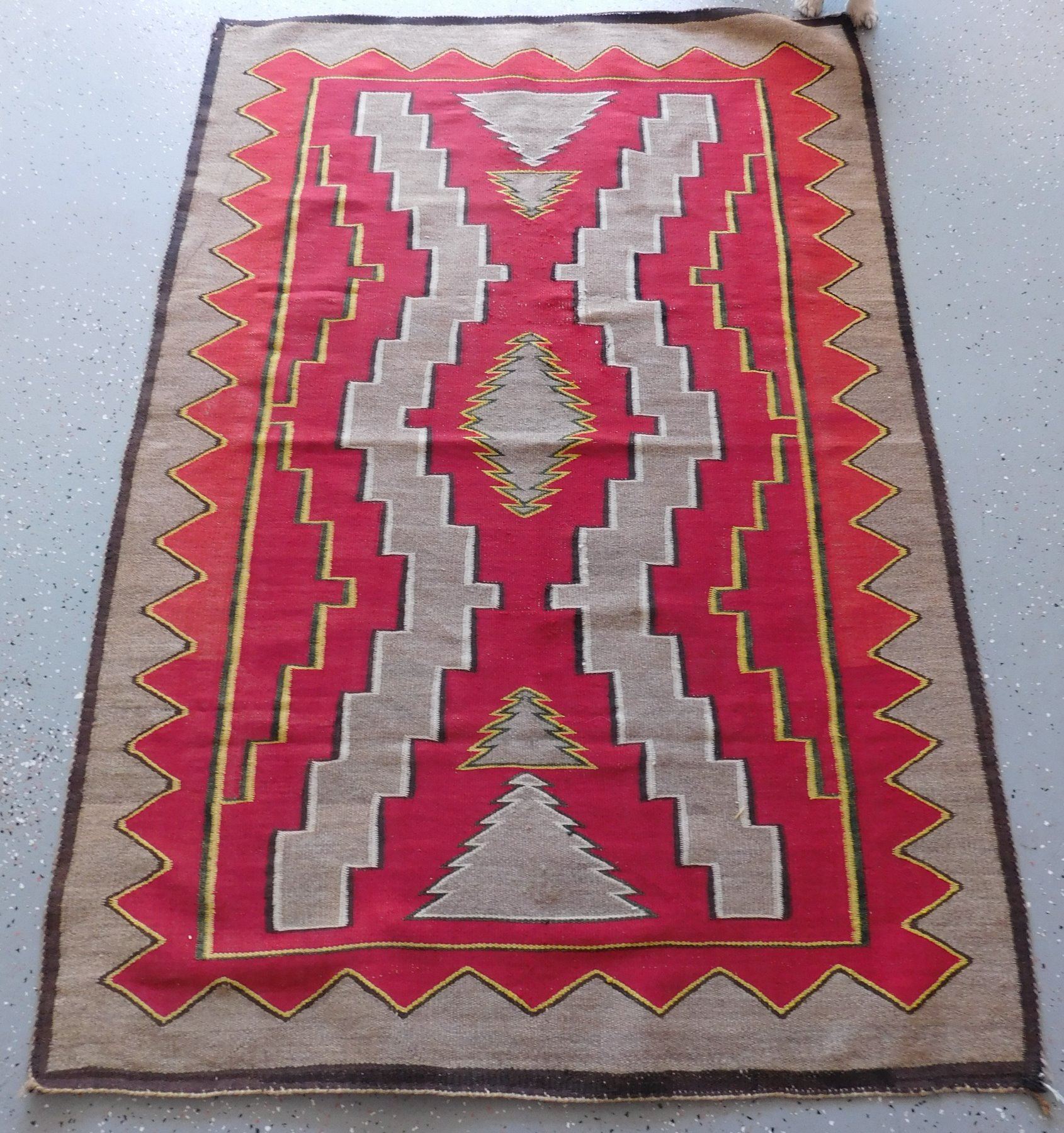 Navajo Weaving, c. 1930s. Made of wool and dye, the item measures 63" x 45". New Mexico. Appears to be either a Ganado or a Red Mesa weaving. Condition: Minor holes, see images. Shipping: $26.50 w/insurance and signature.