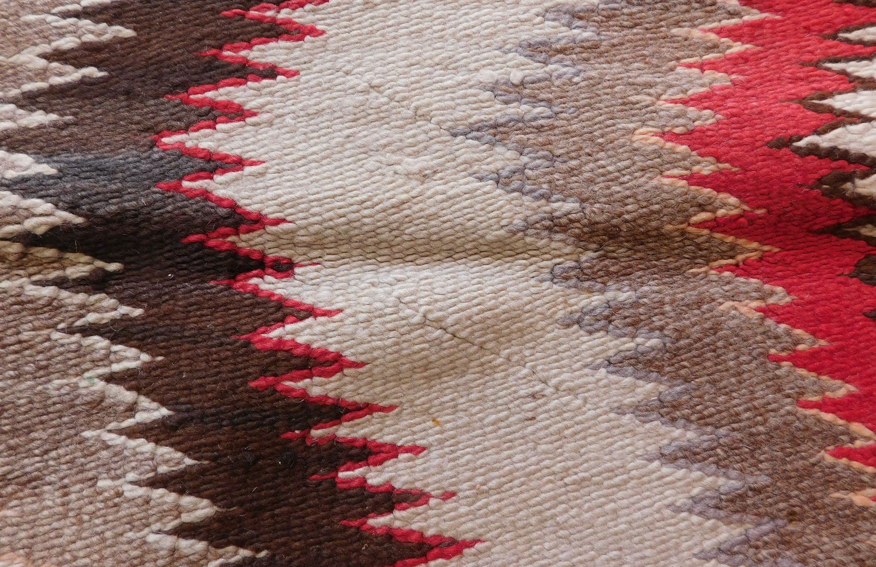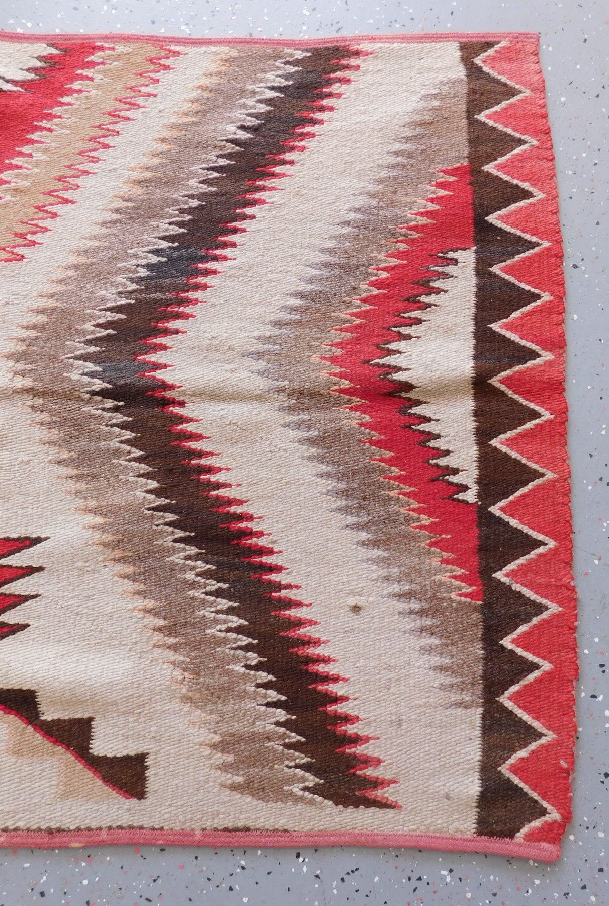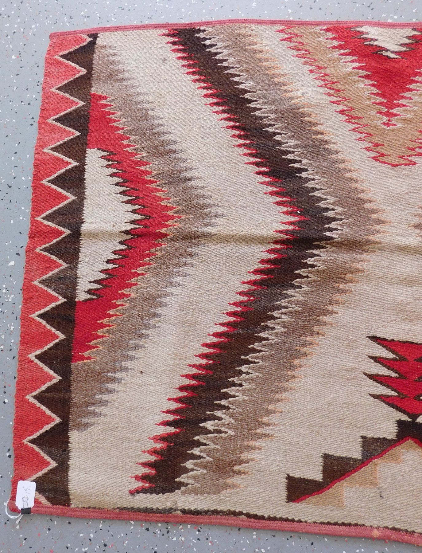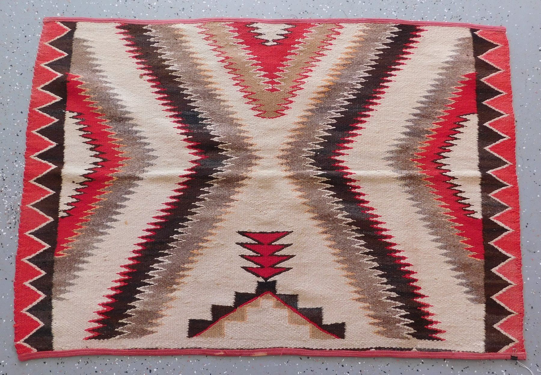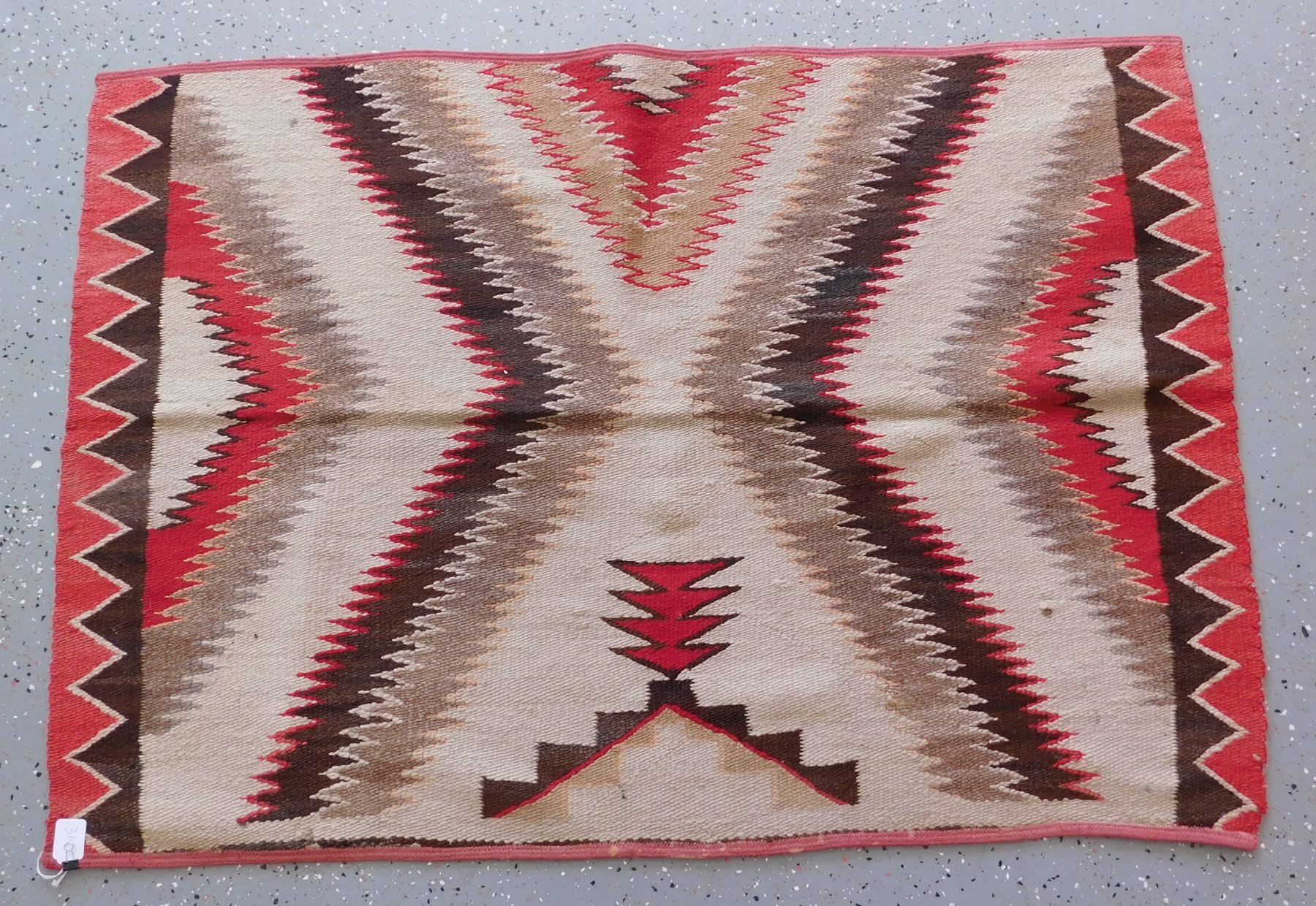 Navajo Weaving, c. 1940s. Made of wool and dye, the item measures 45.5" x 32.5". Navajo. Lazy Lines, tight weave. Condition: Good, minor wear and staining, see images. Shipping: $22.50 w/insurance and signature.