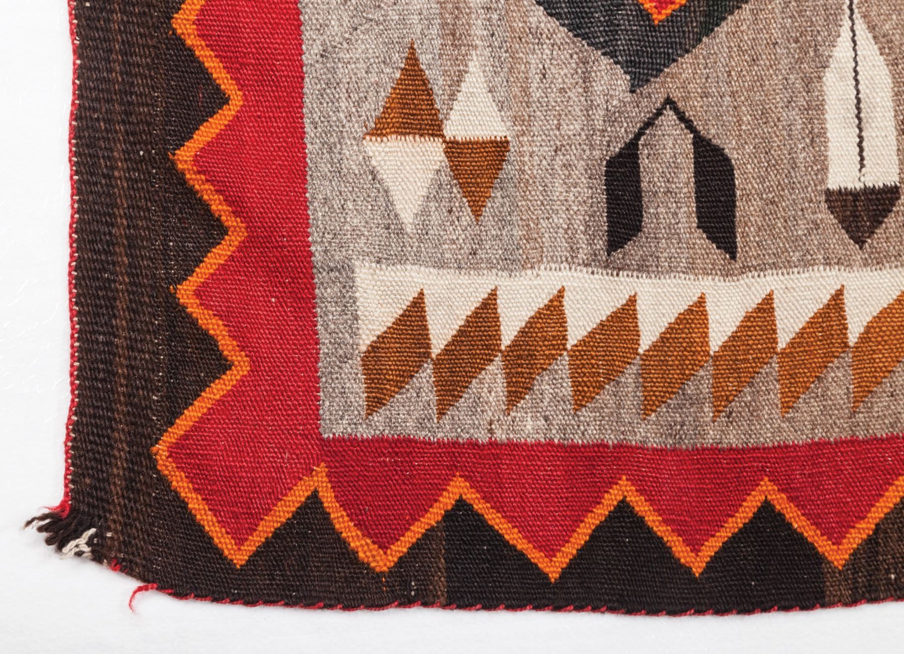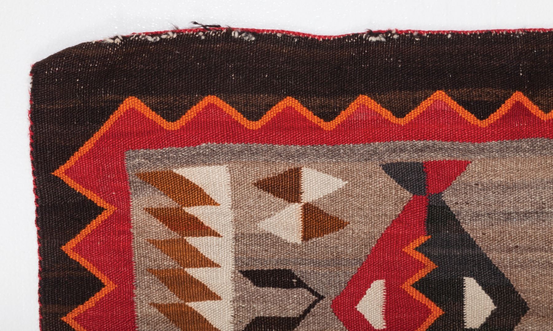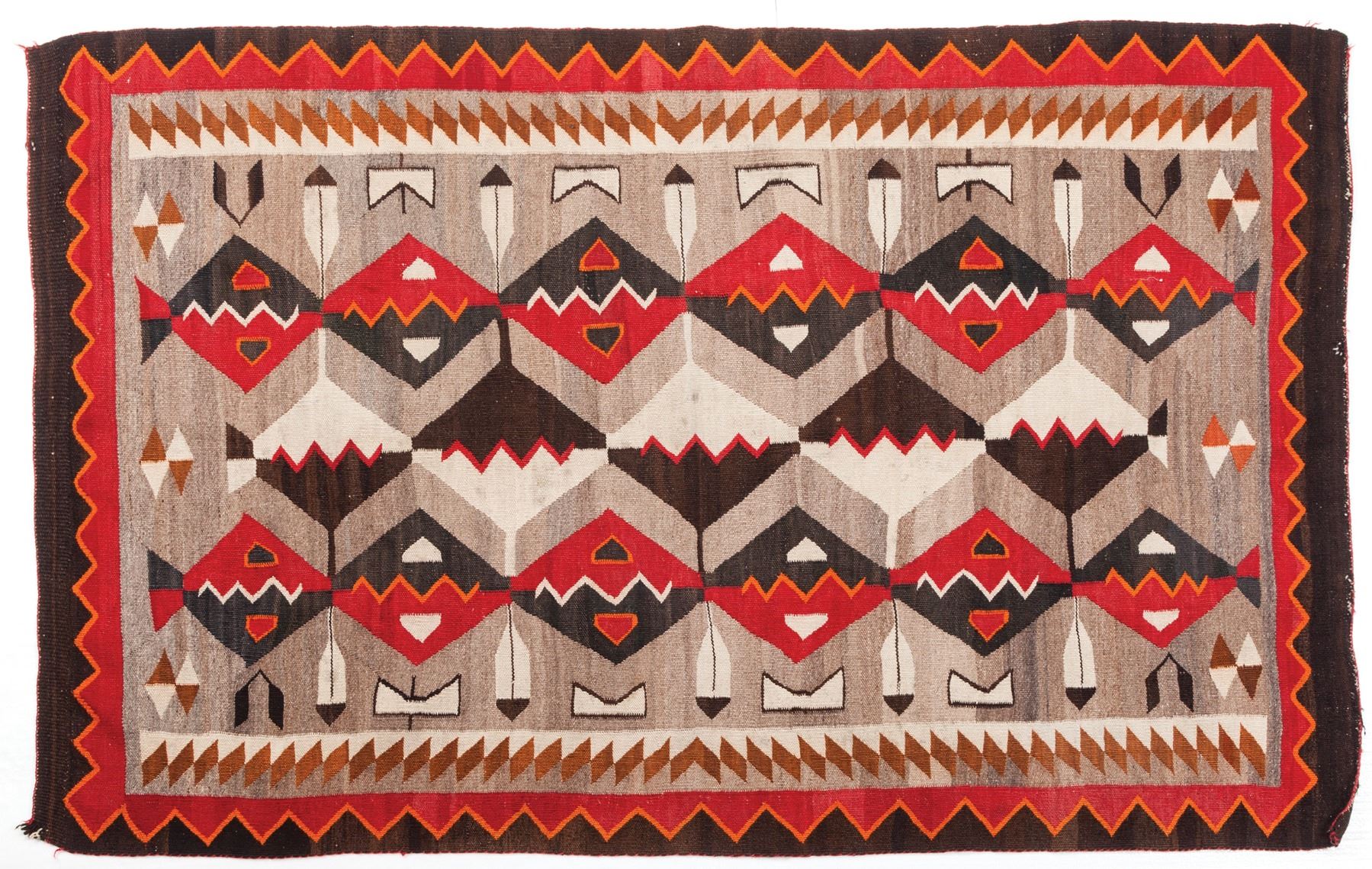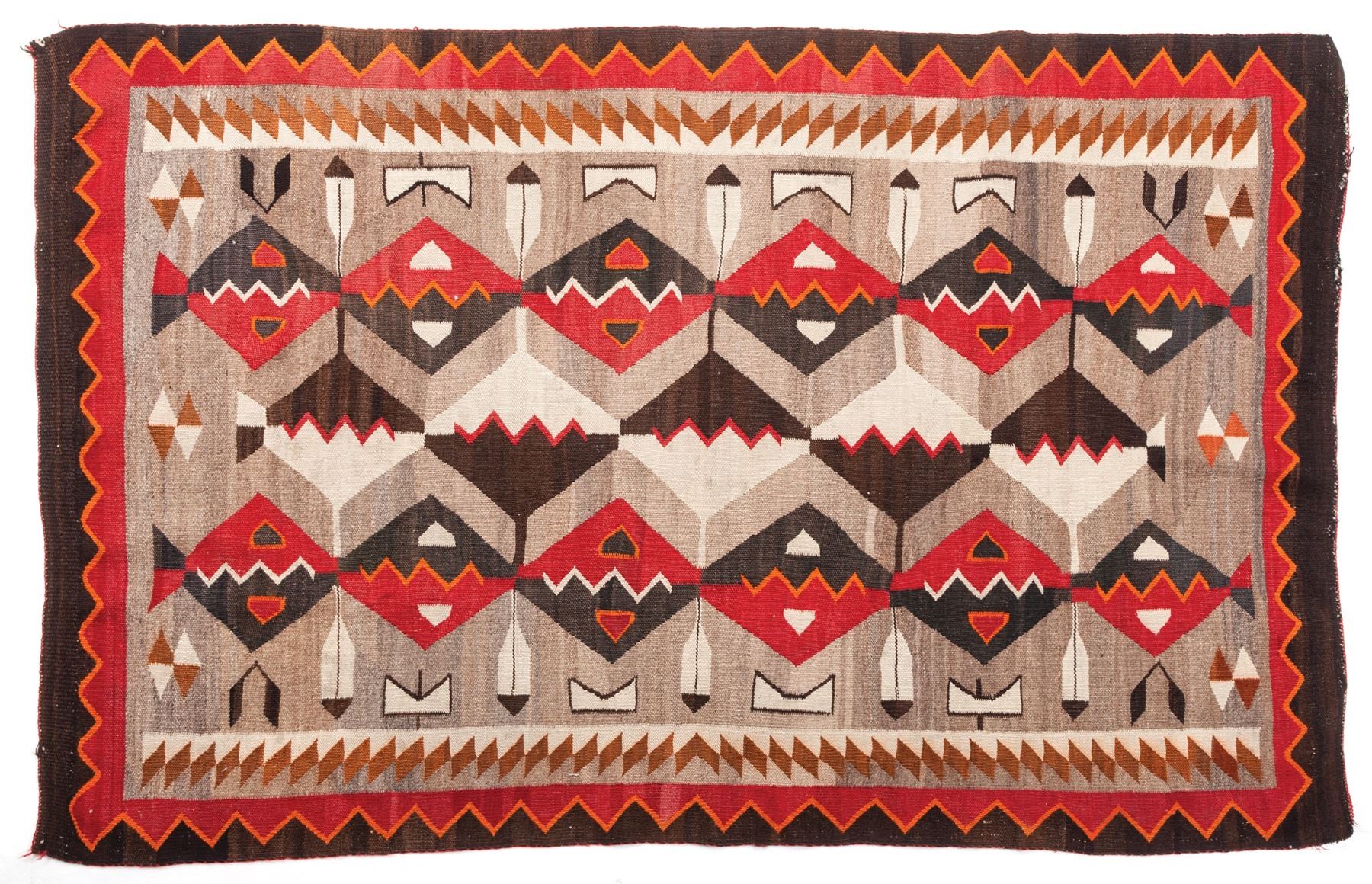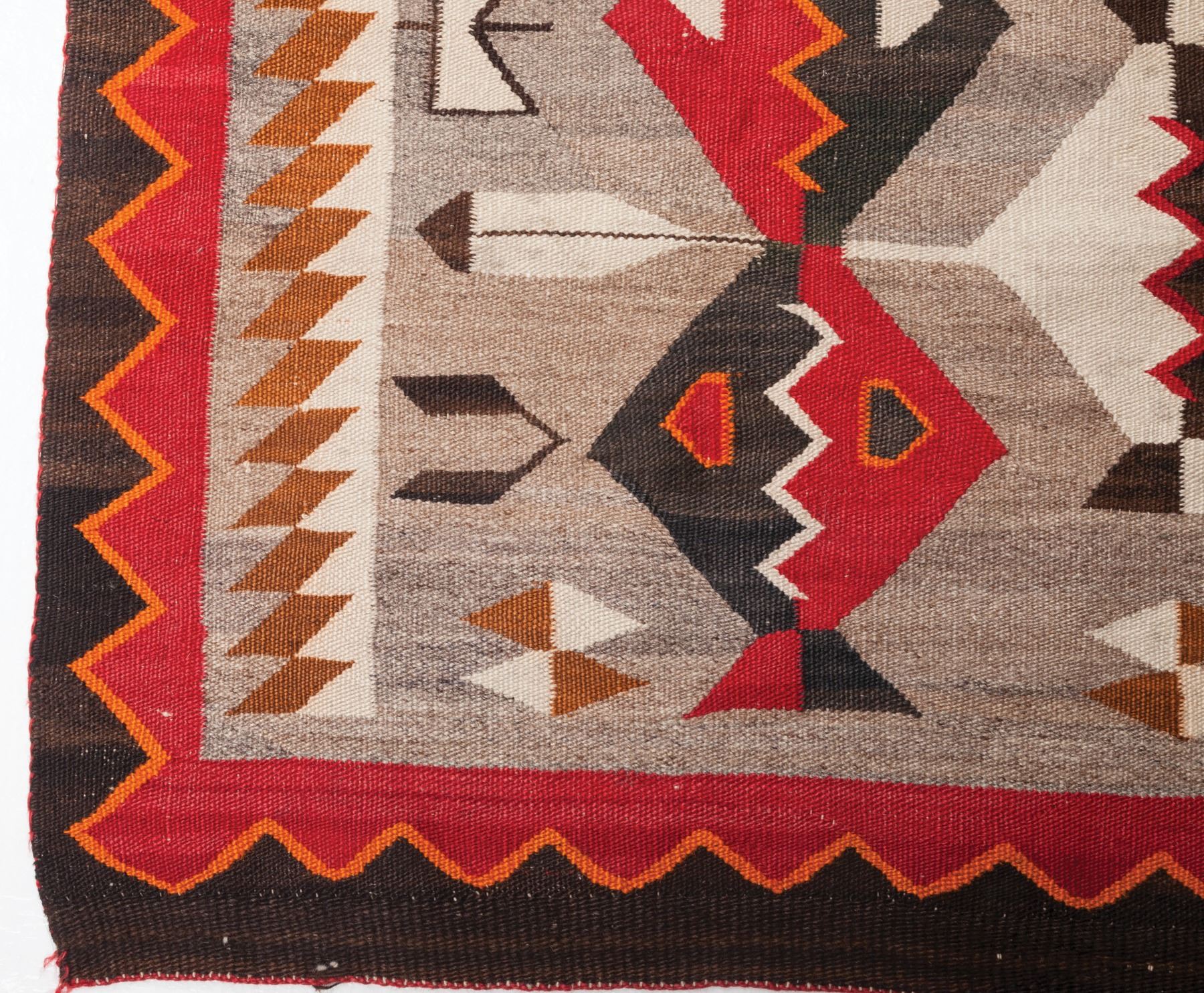 Bright and colorful Navajo rug with feather motif. A complicated design of diamonds creating a zig-zag effect, flanked by ten feathers, floating elements and a serrated bar. All framed in a zig-zag border. Great natural and dyed colors, in brown, tan, cream, gold, red and orange. 69" x 43".