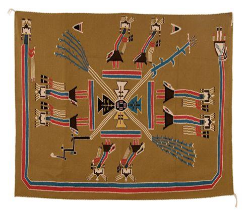 Navajo Weaving. 54” x 64”. Sand painting designs and strong Rainbow people figures. Woven by Desbah Nez (Mrs. King Tut). Excellent condition, circa 1965. (est $2,500-3,500)