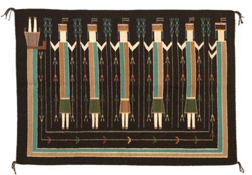 Navajo Weaving. 40" x 55". Yei designs. Six figures on black background. Perfect condition. (est $750-1,000).