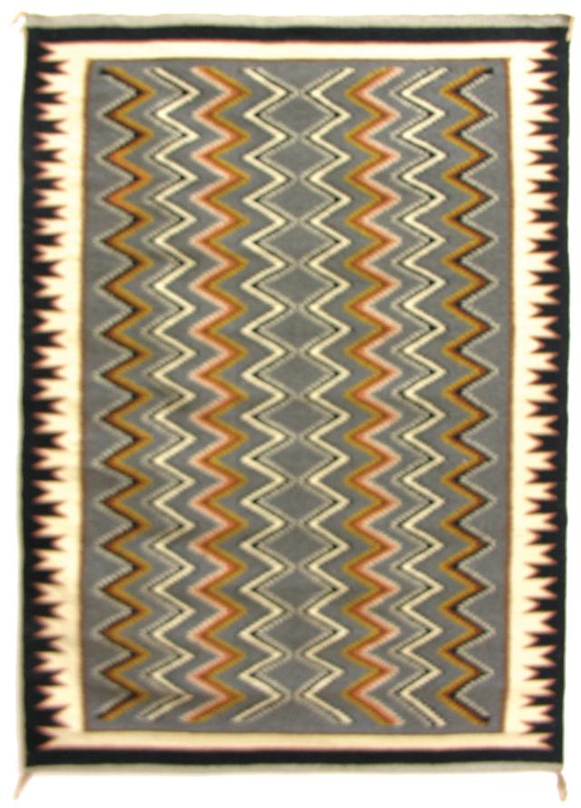 Circa 1970, Minnie Yazzie, Very tightly woven Red Mesa with earth tone serrated diamond designs on gray ground. 6' x 4'2"
