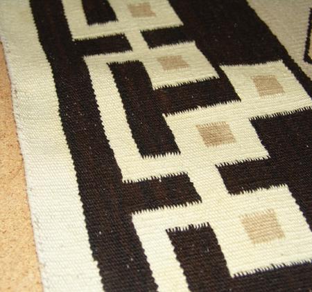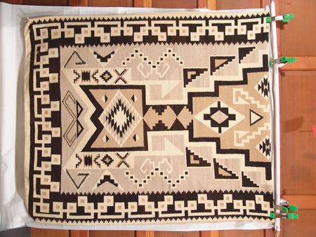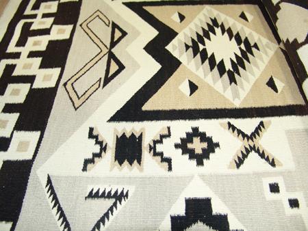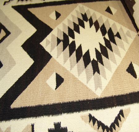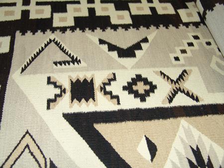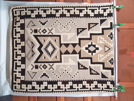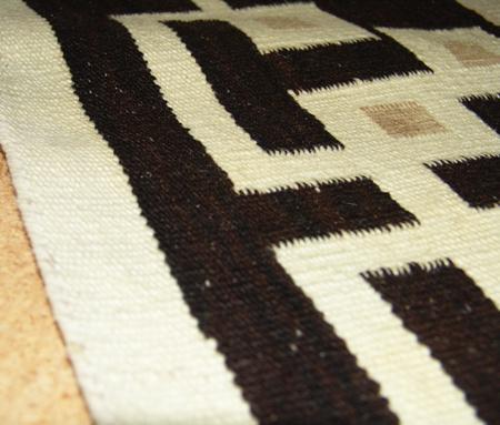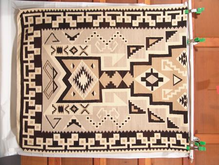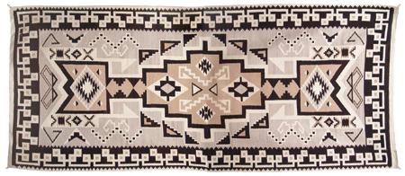 Very large Navajo Crystal/Two Gray Hills floor rug with bold black/brown/tan central terrace diamond motif. Purchased from Meigs in 1992 for $2,500; appraisal value $7,500. Condition: very good, a few tiny holes, small damage on one end. 112" x 49"
