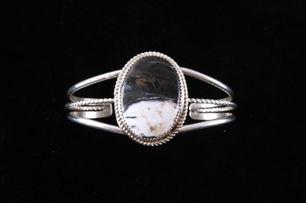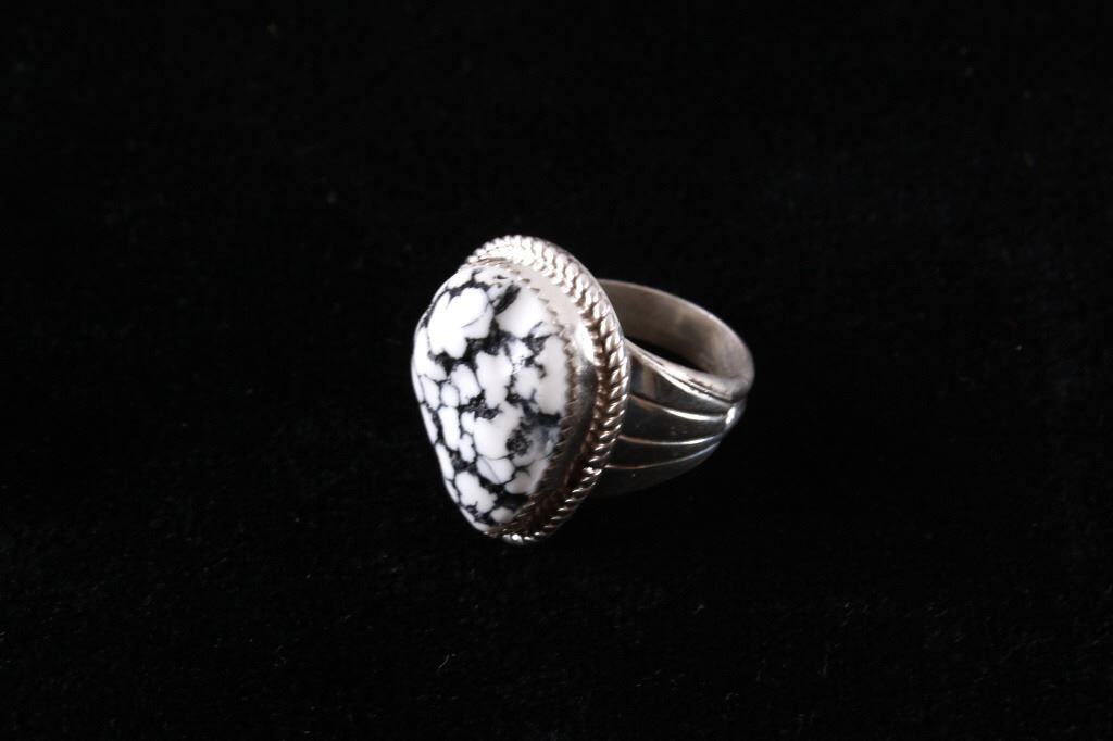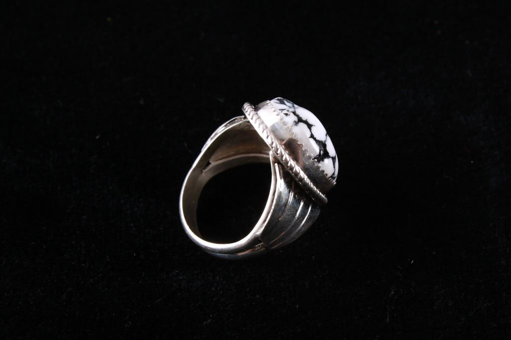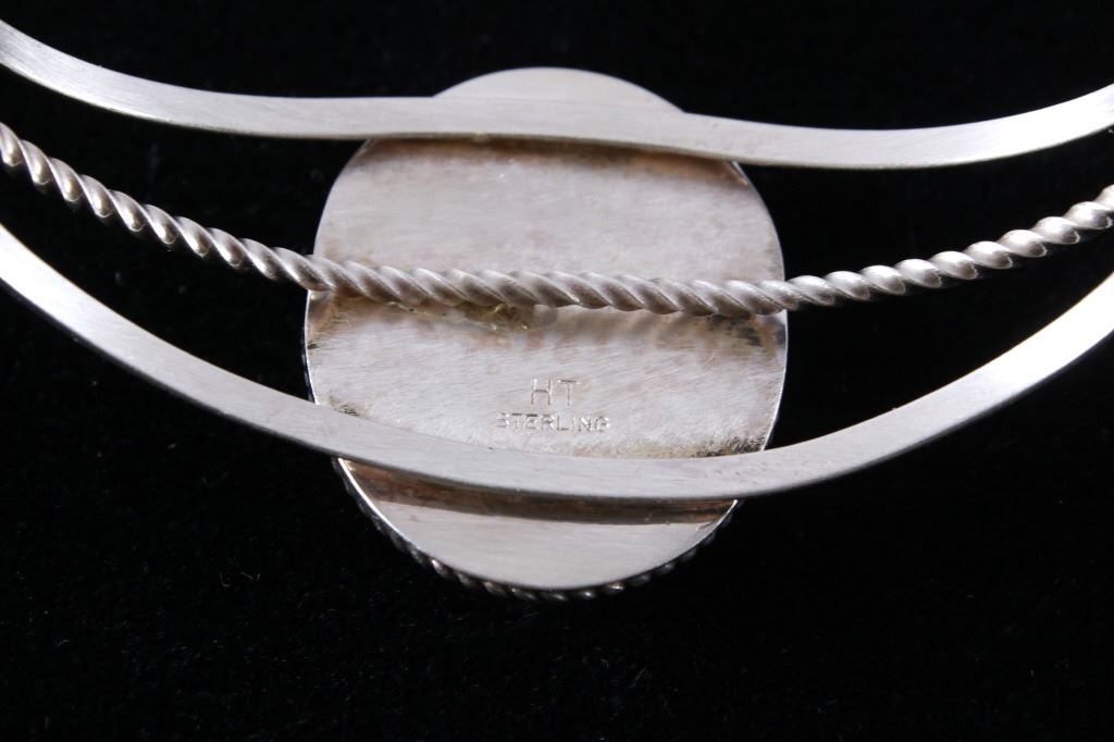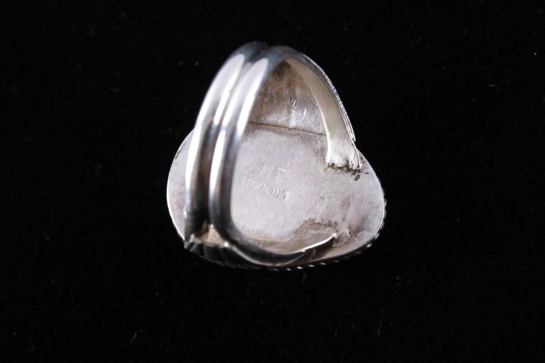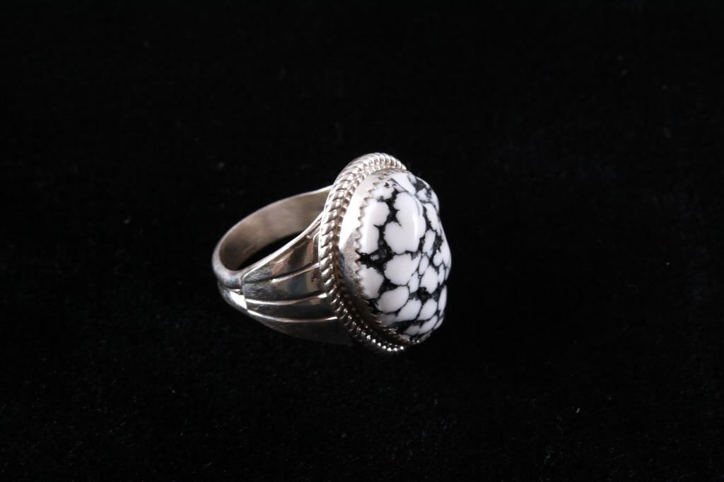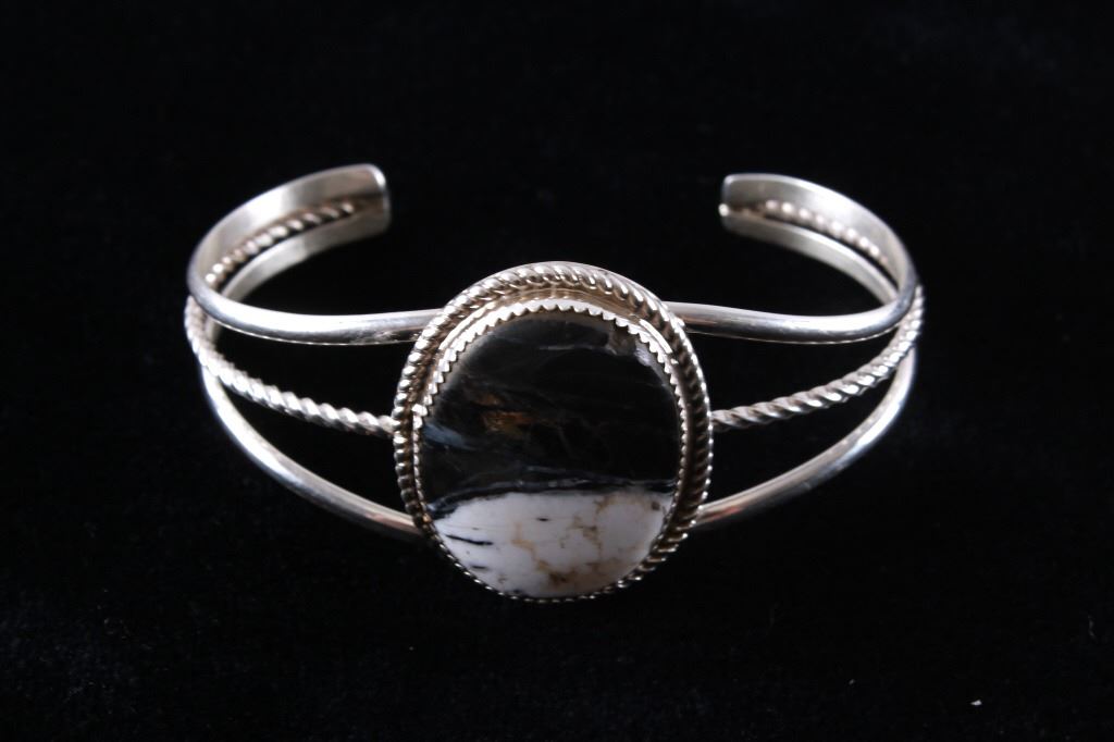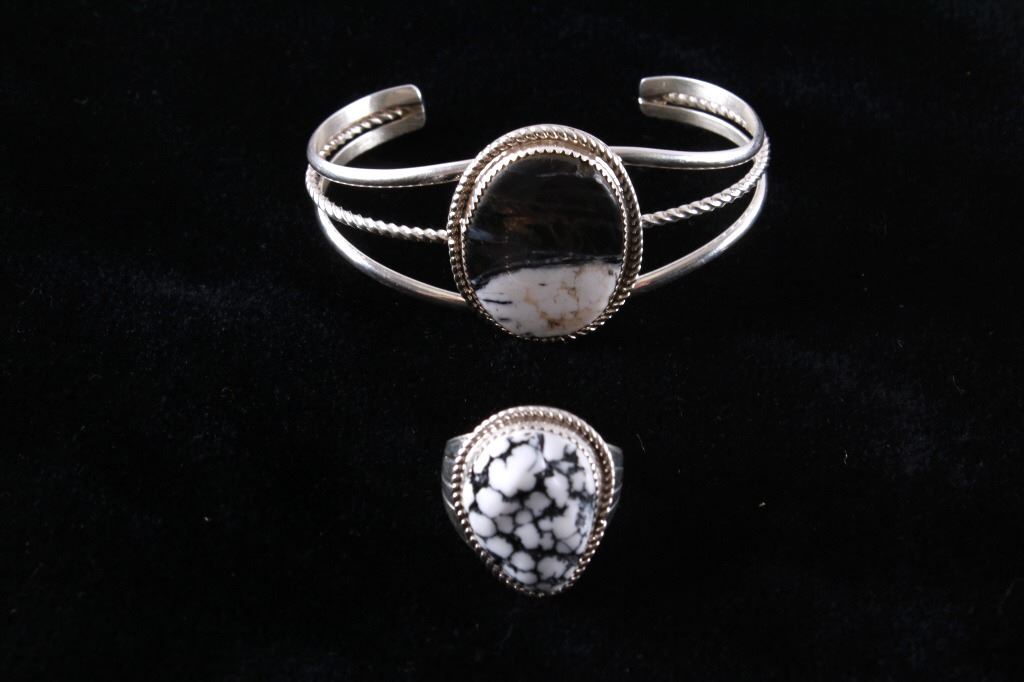 The lot features a set including a nice large bracelet and ring from Navajo Herbert Tsosie sterling silver set with White Buffalo Turquoise. Both pieces are signed "HT Sterling" and are set with polished cabochons of White Buffalo Turquoise showing a rich whtie and black matrix stone. The ring has a gery nugget like large stone set in sterling silver with a nice large men's size of 10.5 US. The bracelet has a triple sterling band, center one being a rope twisted, and at the top a beautiful sterling silver setting with large oval polished White Buffalo Turquoise. Truly an excellent nice size set from the same well accomplished master silversmith, Navajo Herbert Tsosie. The bracelet measures 7"L inside circumference wrist size which includes the 1 3/8"W opening. Total weight of the two pieces is 41.9 grams.