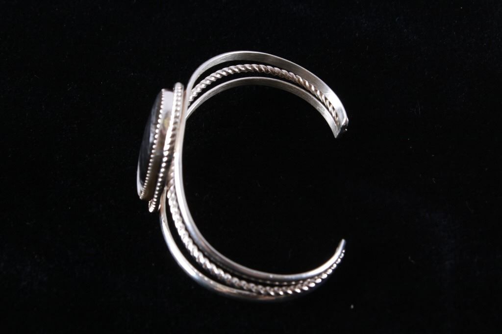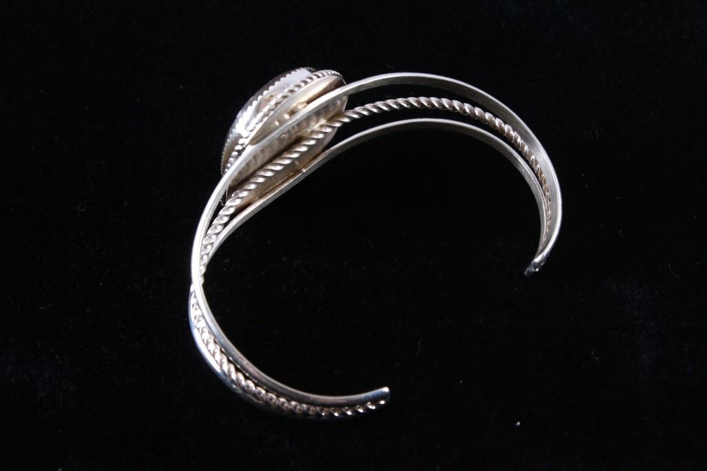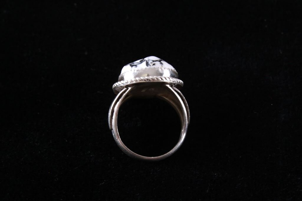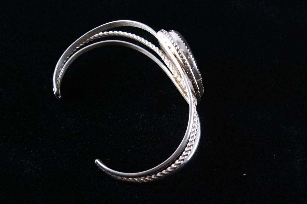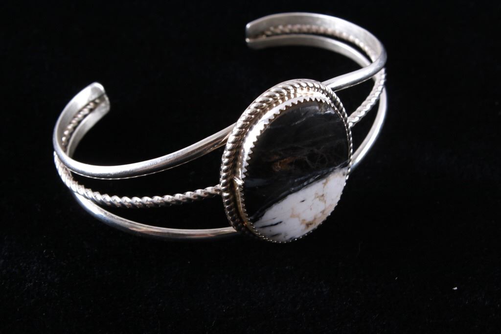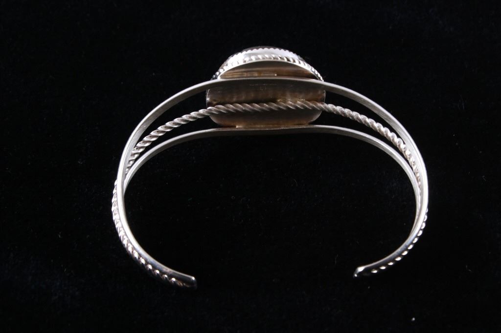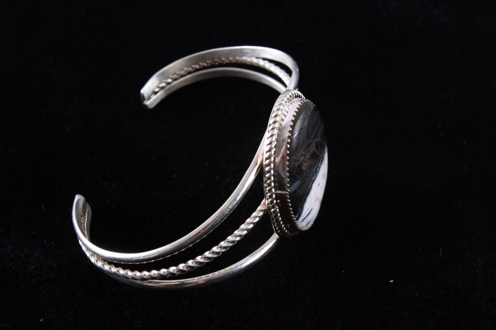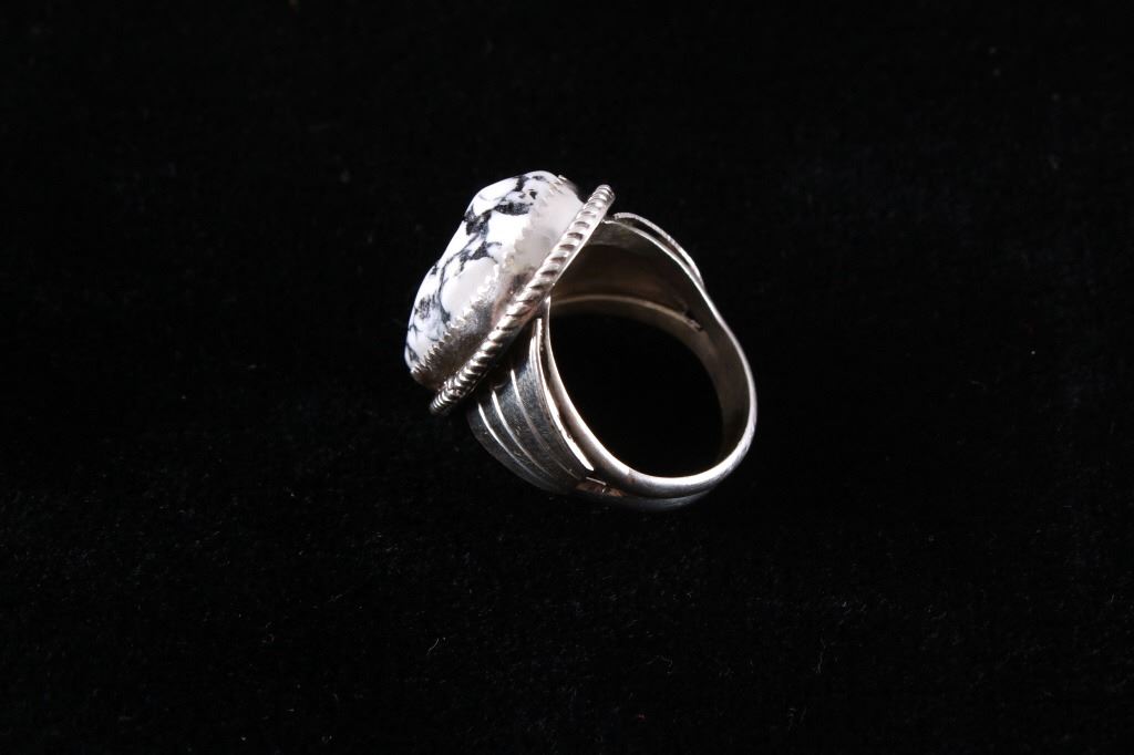 The lot features a set including a nice large bracelet and ring from Navajo Herbert Tsosie sterling silver set with White Buffalo Turquoise. Both pieces are signed "HT Sterling" and are set with polished cabochons of White Buffalo Turquoise showing a rich whtie and black matrix stone. The ring has a gery nugget like large stone set in sterling silver with a nice large men's size of 10.5 US. The bracelet has a triple sterling band, center one being a rope twisted, and at the top a beautiful sterling silver setting with large oval polished White Buffalo Turquoise. Truly an excellent nice size set from the same well accomplished master silversmith, Navajo Herbert Tsosie. The bracelet measures 7"L inside circumference wrist size which includes the 1 3/8"W opening. Total weight of the two pieces is 41.9 grams.