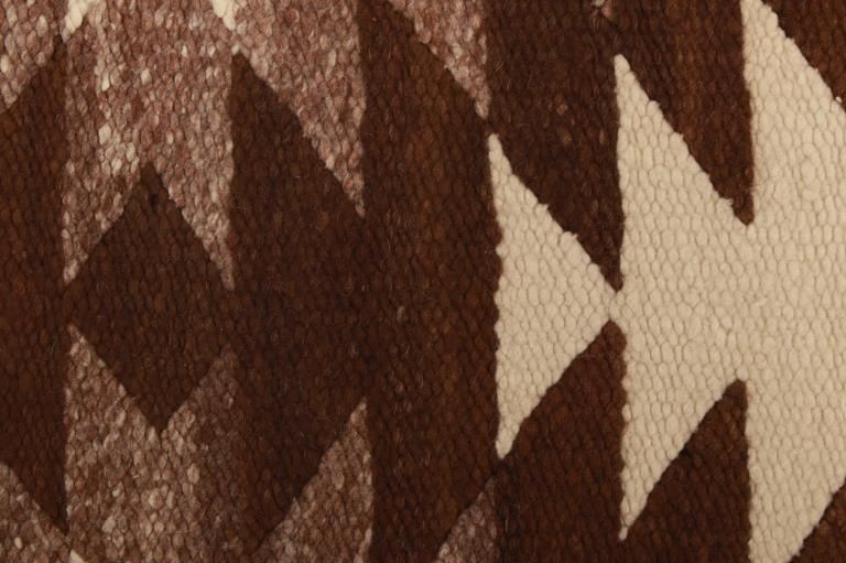 Featured in this lot is this Navajo Wide Ruins crystal eye dazzler sample rug, circa 1940's. The rug shows a fantastic example of eye dazzler design with off-white, light brown, and brown coloration and traditional crystal eye dazzler design. The rug dates to the circa 1930’s and is in a very attractive Crystal pattern with Eye Dazzler detail, showing well-preserved, good condition. Originally, the Old Crystal trading post was established in 1894 in a remote part of the Navajo Reservation, southwest of Two Grey Hills and northwest of Gallup. In 1896, J.B. Moore purchased an interest in the trading post and re-named it Crystal after a pure sparkling mountain spring that was in the area. Due to the remoteness of the Trading Post, he started using a mail order catalog to sell his rugs to the Eastern market. The first catalog came out in 1903, with another in 1911. He left the reservation in 1911. During his stay at Crystal, he greatly influenced the change in styles of Navajo rugs produced at the Crystal Trading Post. The condition of this rug is good, with no obvious signs of damage. The measurements of this rug are 18 3/4" x 15".