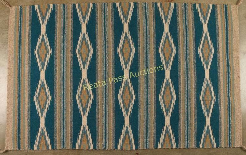 Brown and green, measures 47"l x 30"w, excellent condition. Very tightly woven.