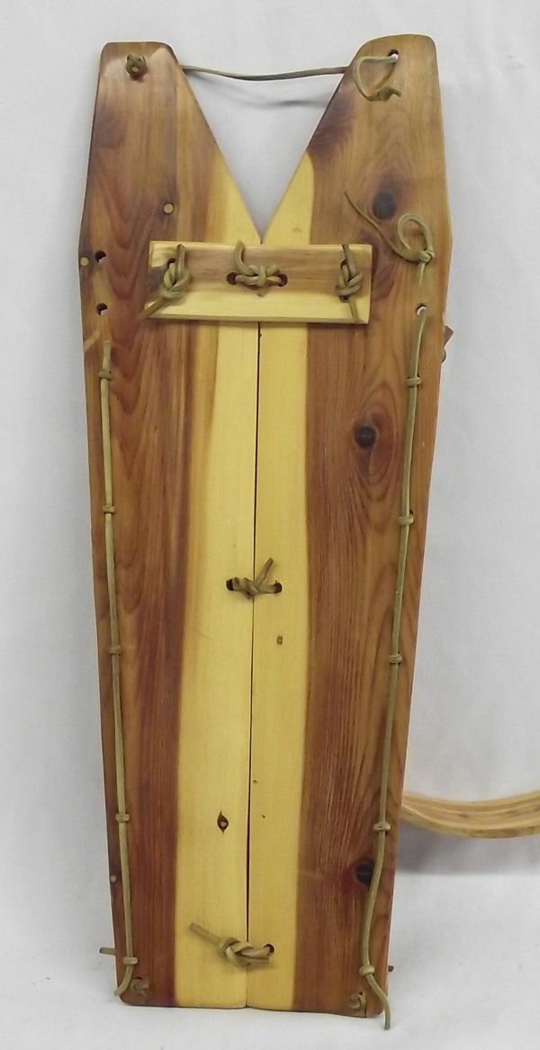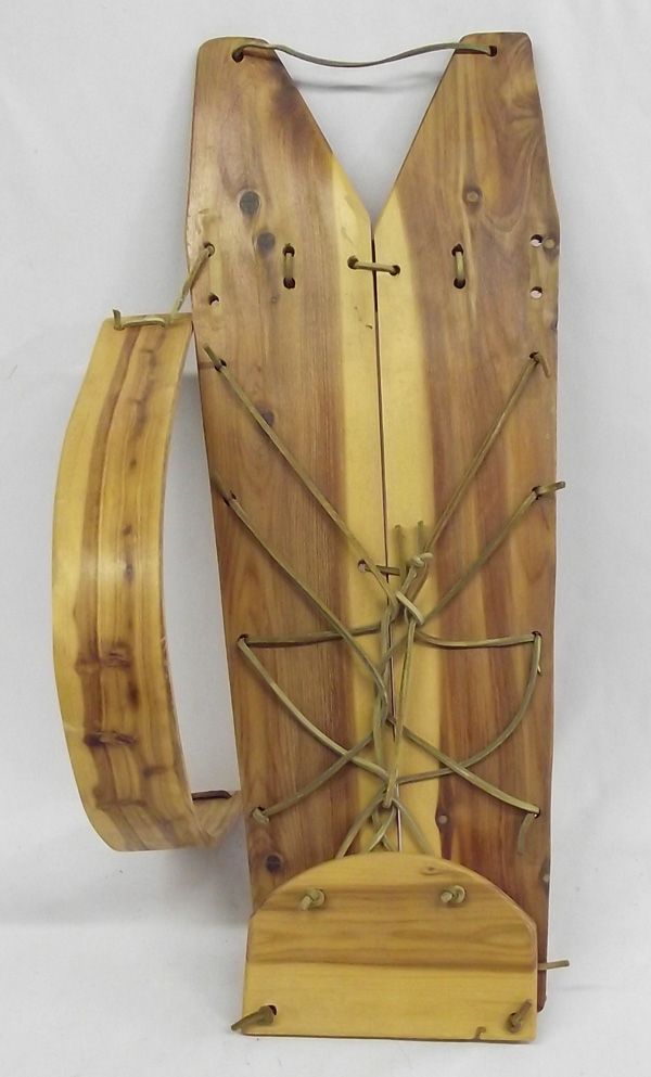 Navajo Wooden Cradleboard. 20.5''H x 11'' W. One leather tie for the head frame is missing. The protective frame for the infant's spine, a foot rest at the bottom and a rounded cover over the infant's head that arcs out from the cradleboard, similar to a canopy or a modern-day baby carriage hood to provide shade for the infant. The headpiece also provides extra head protection in case anything bumps against the cradleboard.
