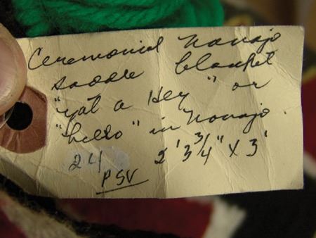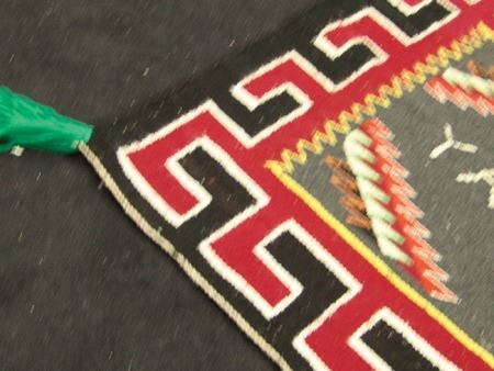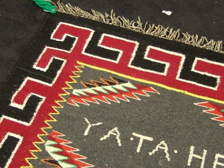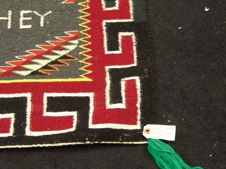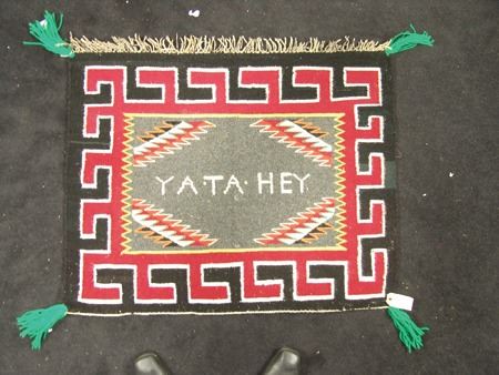 1960s, Colorful finer weave Sunday saddle blanket wall hanger with striking keyed border, serrated elements (with some Germantown wool), fringe, green wool tufts and "Ya-Ha-Tey" (Navajo for hello) printed in center. Very good condition. 35" x 28"