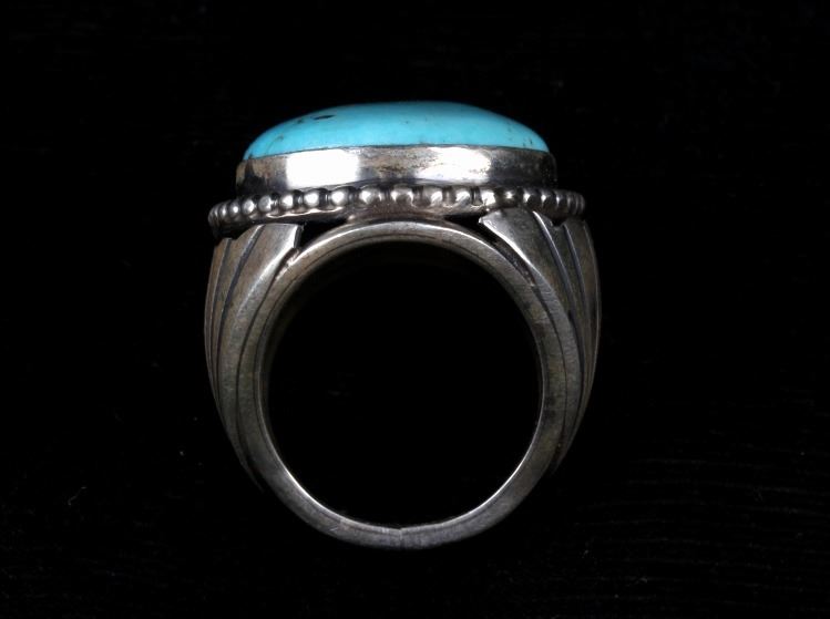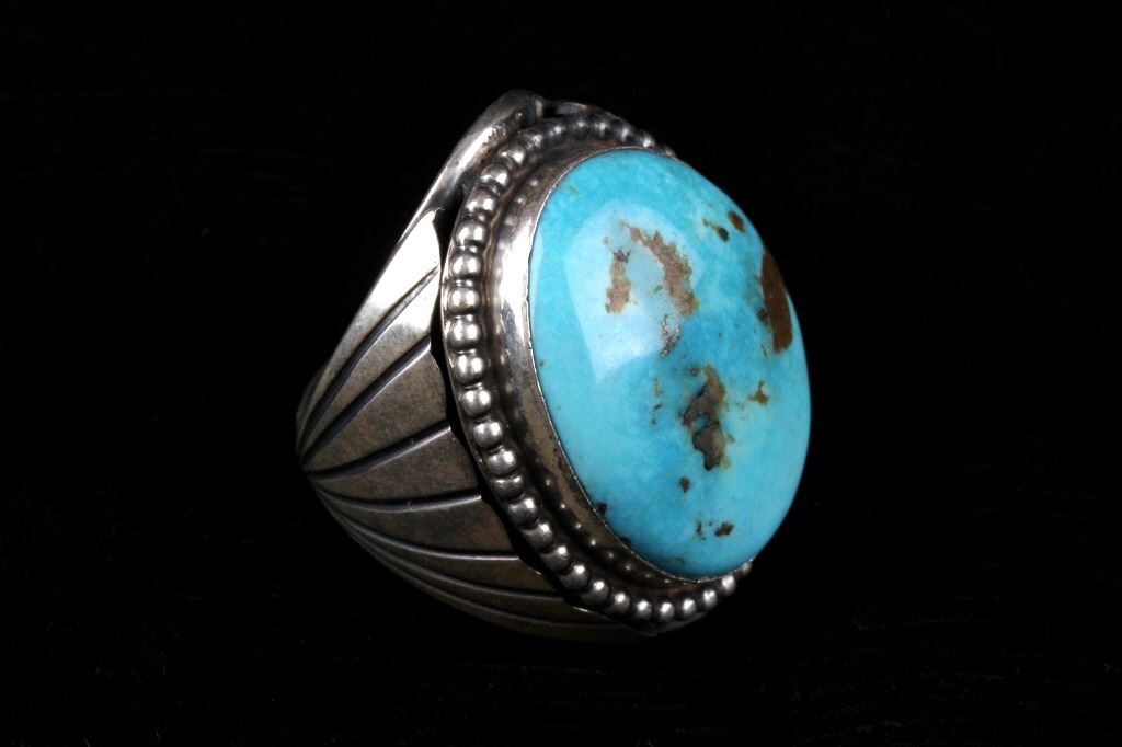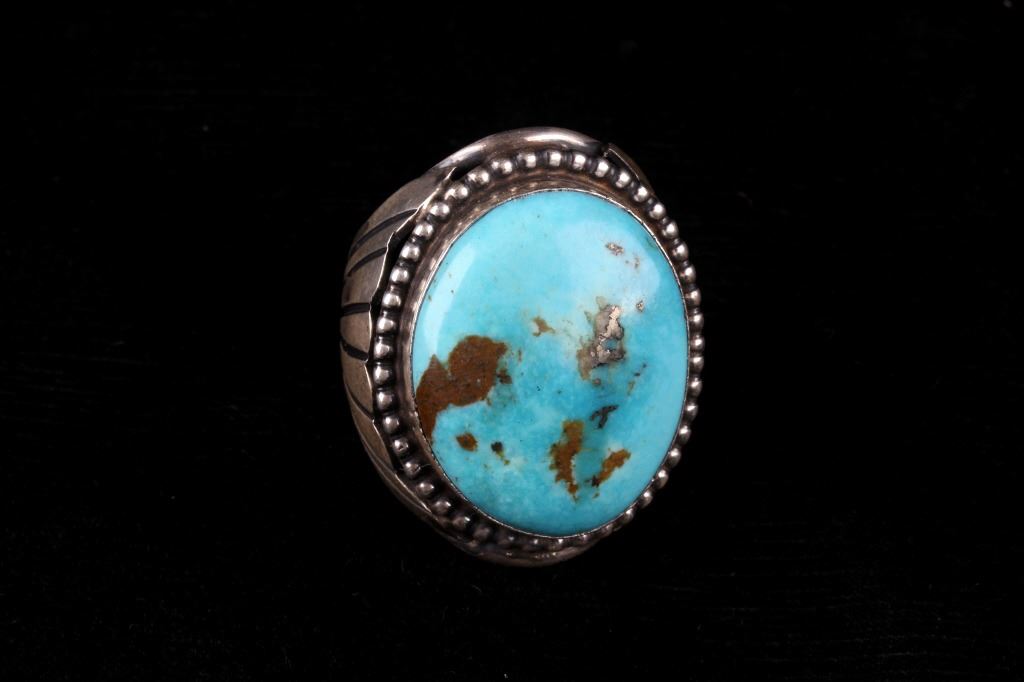 Included in this lot we have a signed Navajo Native American sterling silver and Kingman Turquoise ring. The ring features a large nugget of Kingman Turquoise set into the top of the ring. The piece shows tooled designs across the sides and top including a braided rope accent around the gemstone setting. The interior of the ring is marked "SS Sterling" and a five point star indicating the piece was made by Tony Yazzie. The ring shows good condition overall with a bright patina. The ring is fitted for a US size 10 with the top measuring 1 1/2" long by 1 1/4" wide.