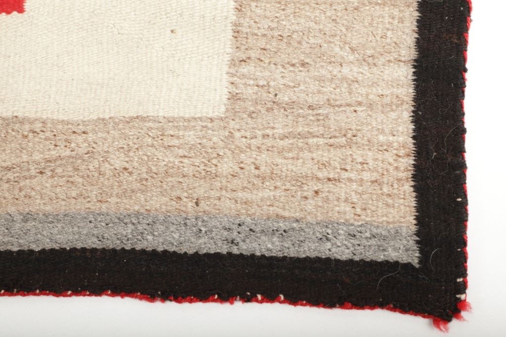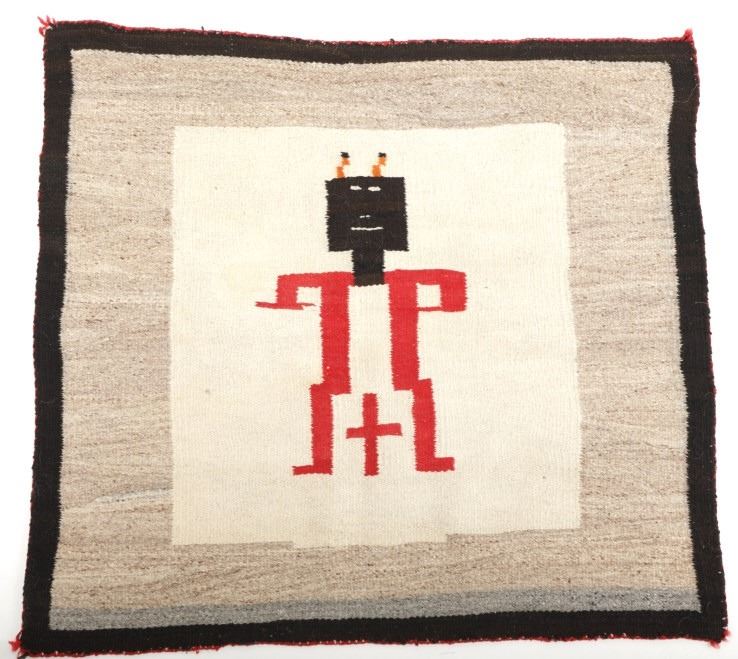 Featured in this lot is this Navajo Yei Be Chei figural polychrome rug circa 1940's. The rug features a wonderfully and professionally crafted wool construction that features a heathered grey and black border with a off white field and shows a Yei Be Chei figural woven into the center of the field that shows colors such as medium red, black, and orange coloration with a red cross between its legs. The Yeibichai weavings are highly individual, therefore, different elements may be found in them. Male Yeis have round heads and Female Yeis have square heads. Other elements included may be: gourds, ruffs of spruce around the neck, fox pelts, moccasins, woven garters or sashes, arrows, corn, clouds, stars, and more. The thread count is 96 threads per square inch. The condition of this Navajo Yei Be Chei rug is good with the tassels on each of the corners missing but otherwise it shows good overall condition. The measurements of this rug 31" x 34". Provenance: From the renowned Sundog Fine Art Bozeman, Montana collection and collected by Bruce VanLandingham. Bruce VanLandingham was a pillar in the American Indian collecting community and a respected expert. Along with being an avid collector, Bruce also was the sole owner of Sundog Fine Art Gallery in Bozeman, which was both part museum and gallery.