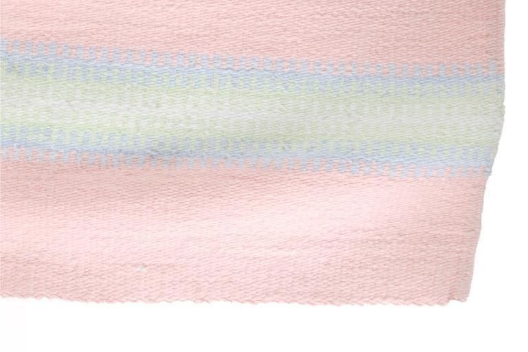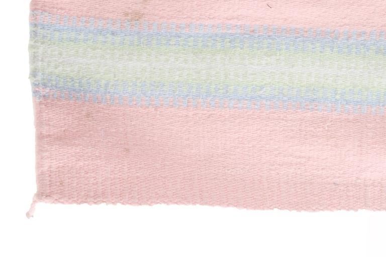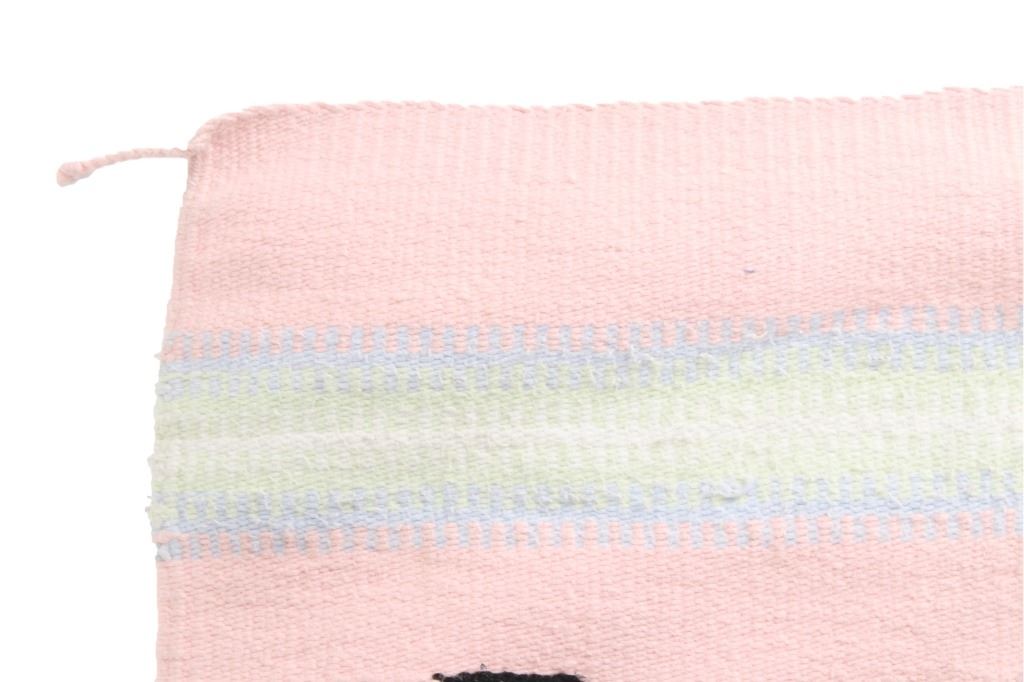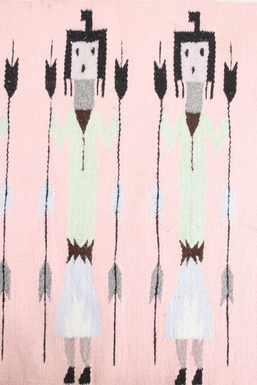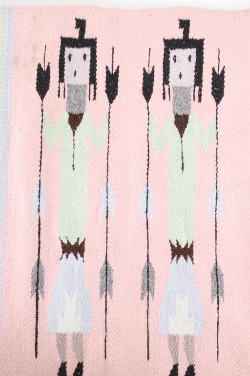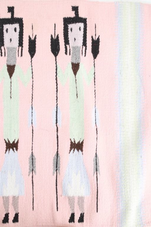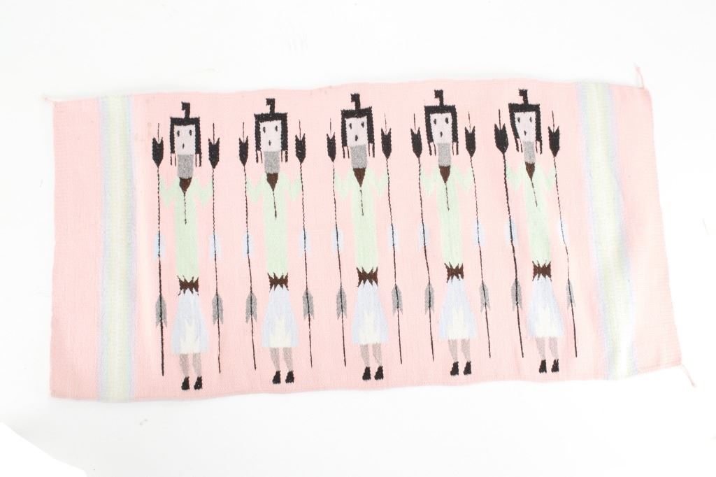 Featured in this lot is this Navajo Yei Be Chei hand woven polychrome rug circa 1980's. The rug features a wonderfully and professionally crafted wool construction. The rug features a pink field with five Yei figures with light blue, light turquoise green, and brown coloration. The condition of this hand woven rug is good with no obvious signs of damage and shows good overall condition. The measurements of this rug are 54 1/2" x 27 1/2". The thread count is 77 threads per square inch.