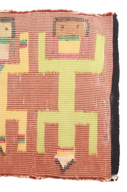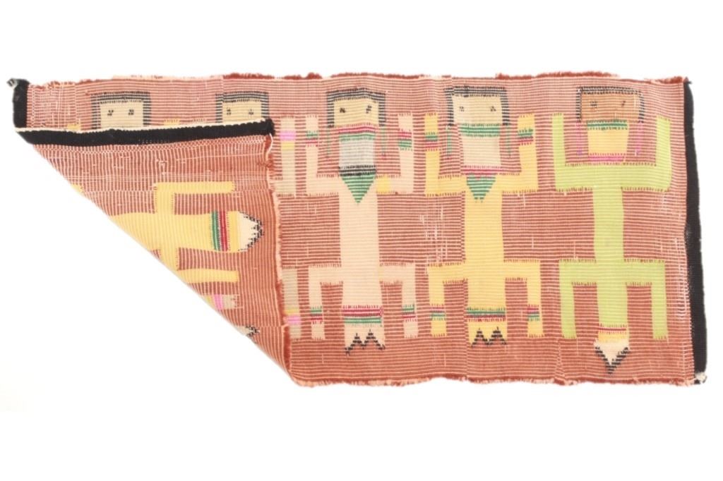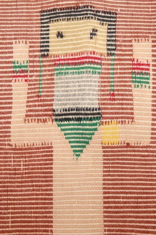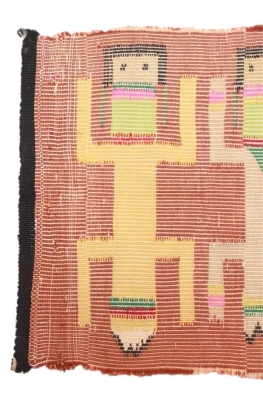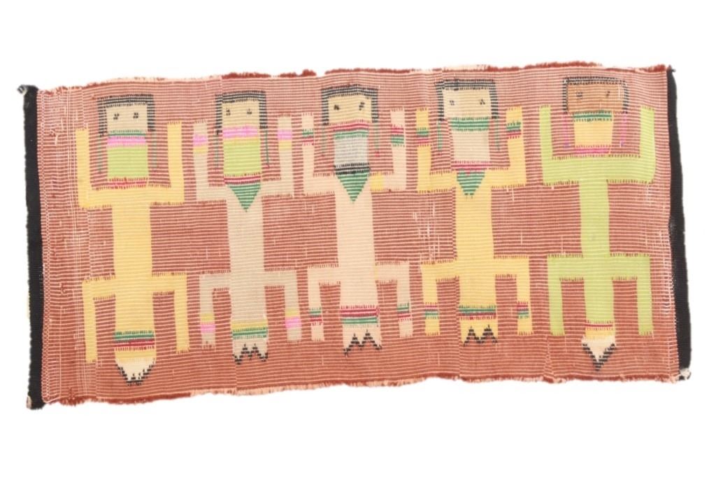 Featured in this lot Navajo Yei Be Chei polychrome wool rug, circa 1950's. Yei is the Navajo name for a deity or a holy one. The Yeis are woven facing outward. They are usually depicted with long bodies and skirts and hold sacred plants or symbols. The rug shows a wonderful Yei example with five figures and naturally dyed colors with bright examples. The condition of this rug is good good to fair with slight wear tot he rug but otherwise in good to fair overall condition. The measurements of this rug are 38" x 17 1/2".