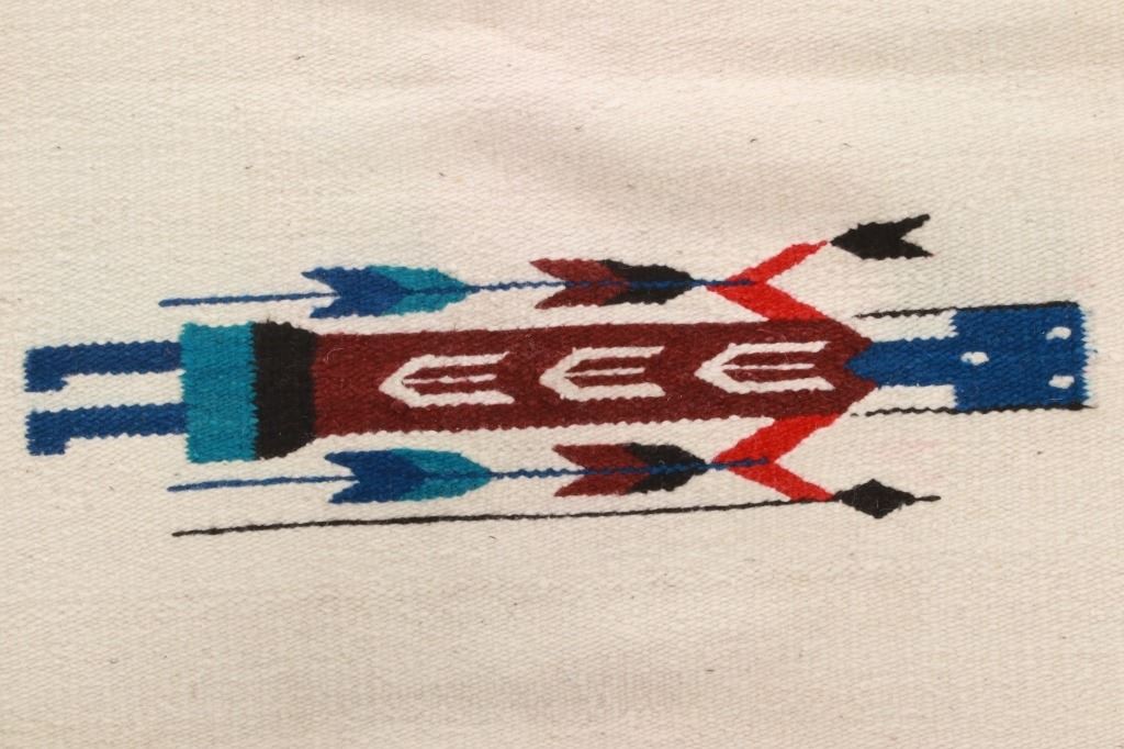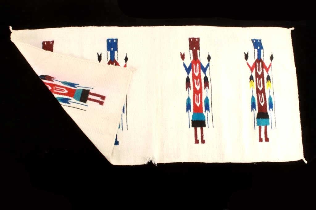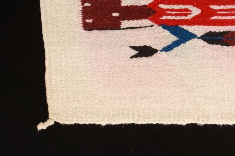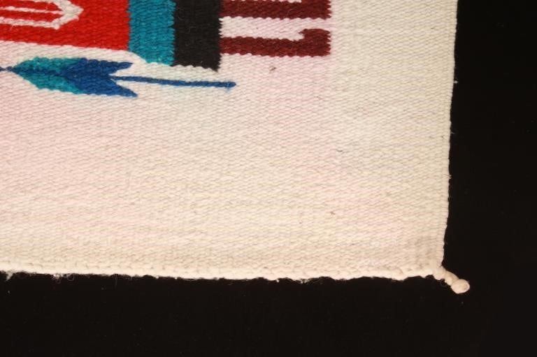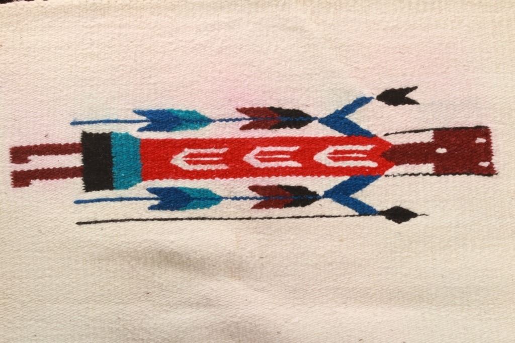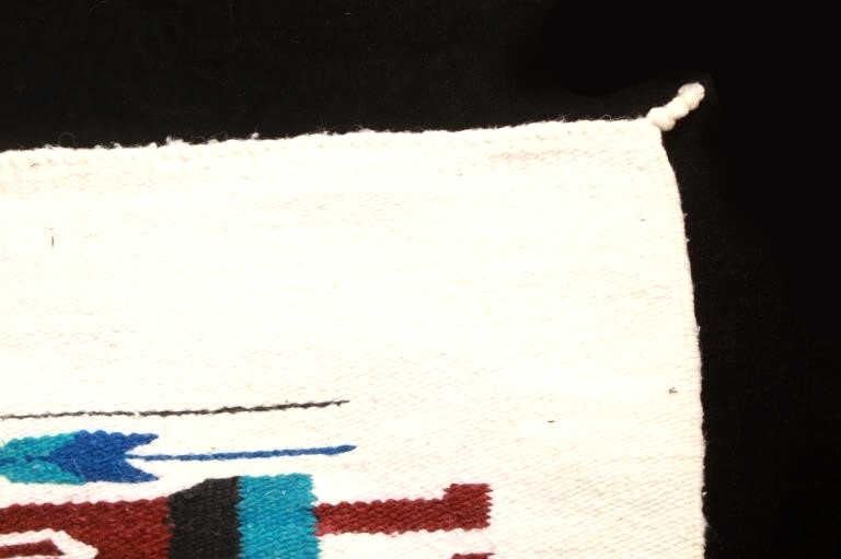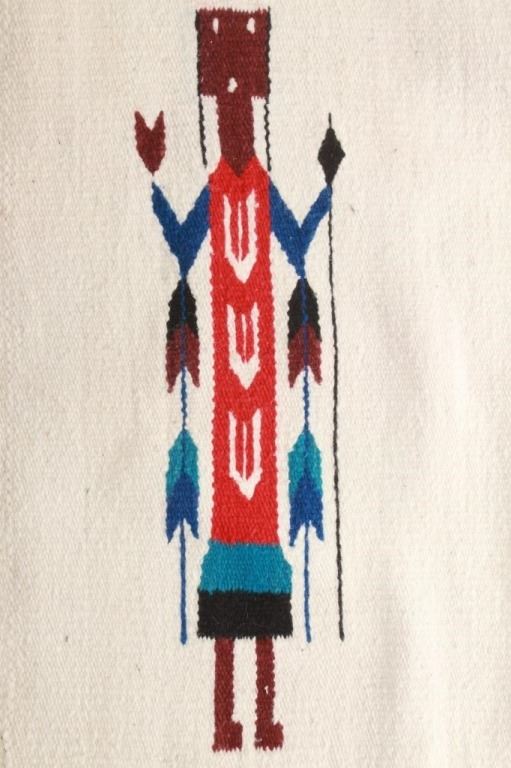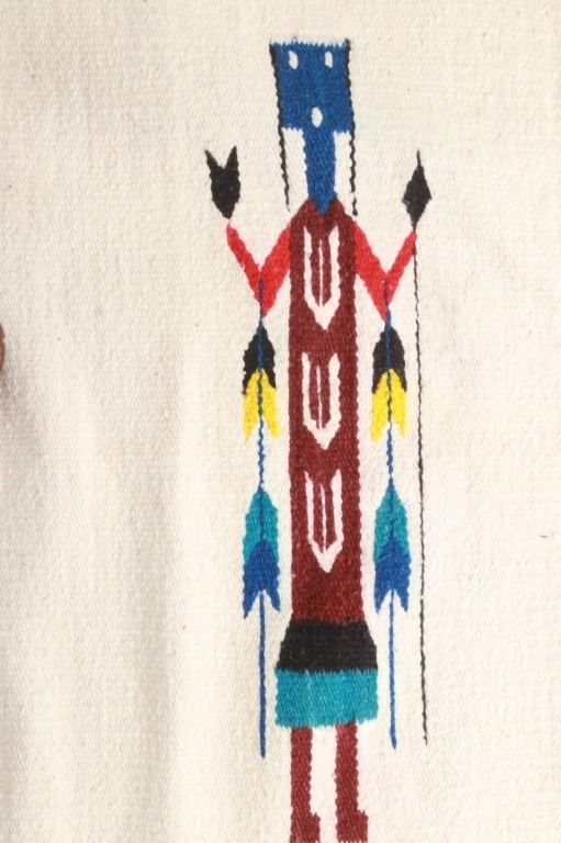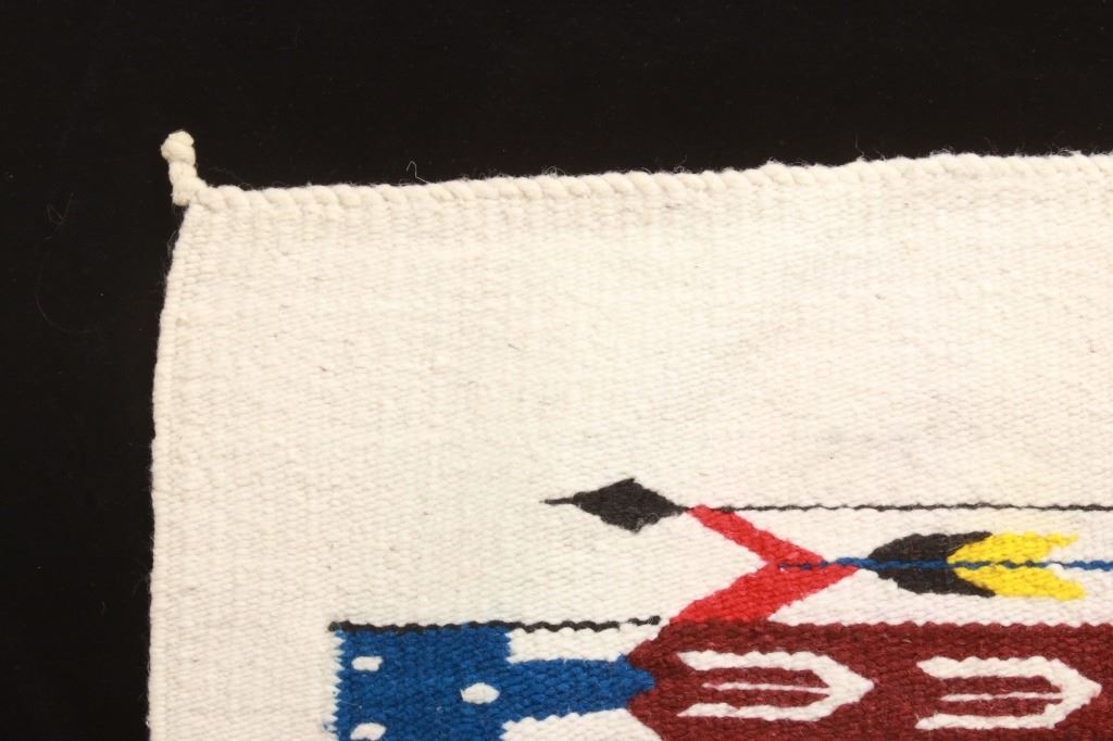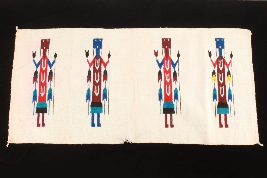 Featured in this lot is this Navajo Yei Be Chei polychrome wool rug circa 1950's. The rug shows four traditional yei figurals and shows colors of maroon, black, turquoise, red, blue and black all set to a off white field. The Yei Be Chei dancers are the human impersonators who perform the ceremonies. The Yei Be Chei weavings present the dancers as they dance, perform, and enact the ceremony of the Yeis. Ceremonies are performed to either attract or exorcise effects to The People. Yei is the Navajo name for a deity or a holy one. The Yeis are woven facing outward. They are usually depicted with long bodies and skirts and hold sacred plants or symbols. The condition of this rug is fair to good with some bleeding denoting some age and also that this rug is naturally dyed but, the rug also shows some wear to the bottom edge of the rug but otherwise in fair to good condition. The measurements of this rug are 58" x 28 1/4".