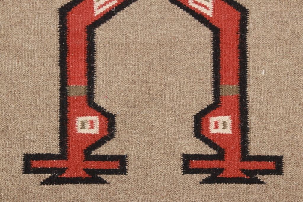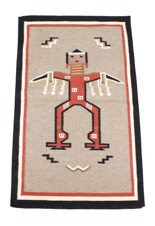 Featured in this lot is this Navajo Yei Be Chei style custom woven rug. The rug features a wonderfully and professionally crafted wool blend construction that shows the likeness or embodied spirit of a Yei Be Chei figural design that shows a clothed Yei figure set to a red field and shows a black and off white border with an inner layer of salmon brown and shows a light grey field with the Yei figural showing black, brown, off white, green, gold, and salmon brown coloration. The condition of this Navajo stylized rug is good with only slight wear to the weave throughout the rug but otherwise shows a good overall condition. The measurements of this rug is 60" x 36 1/2". The thread count is 64 threads per square inch. Rug done in the style of Navajo, but not made by a Navajo artist.